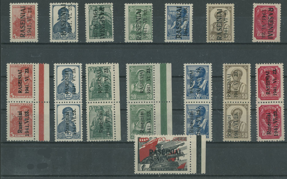 1941, reading up black overprints ”Raseiniai. 1941.VI.23” on Soviet definitives of 5k-60k, complete set of seven in vertical pairs of types I-II, complete set of type III, stamps of 60k with inverted overprint, in addition horizontal overprint on Army Anniversary stamp of 1r, all with full OG, NH, VF, most with experts’ handstamps, Mi #1-7, I, II, III, 11, C.v. €790, Est. $300-$400