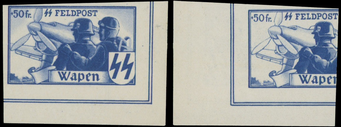 1944, Airplane and two Soldiers, inscribed ”SS FELDPOST. Wapen” +50fr ultra, bottom right corner sheet margin imperforate plate proof printed on both sides, reversal imprint is shifted as always, cut close at top left, no gum as issued, F/VF, Mi $XVIII P, priced with ”-”, Est. $150-$200