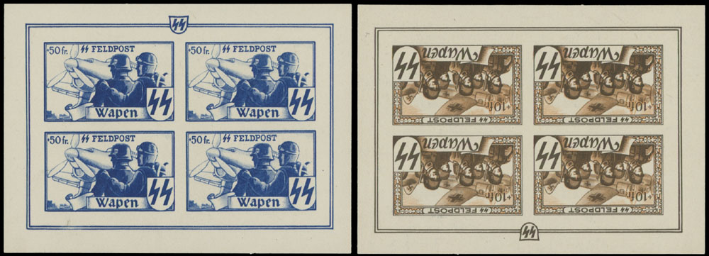 1944, Airplane and two Soldiers, inscribed ”SS FELDPOST. Wapen” +50fr ultra, imperforate plate proof in miniature sheet of four with design of +10fr orange brown printed upside down on reverse, no gum as produced, NH, VF and rare, Mi #XVIII P, each stamp priced with ”-”, Officiel E44, C.v. €1,600, Est. $800-$900