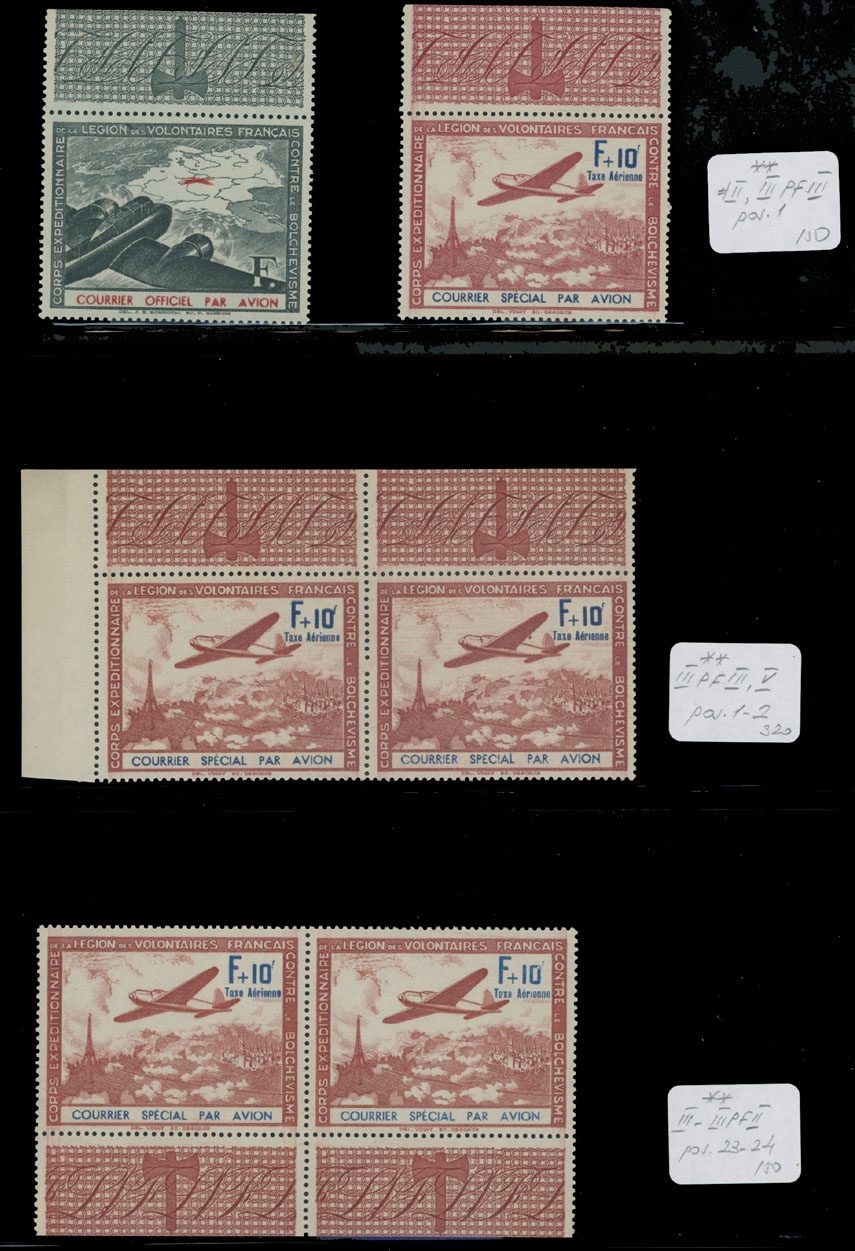 1941, F(+10fr) greenish black and red and five of F+10fr brownish red and blue, including two horizontal pairs, representing cut bottom of ”F”, missing dot above ”i”, missing accent over ”E” and etc. full OG, NH, VF, Mi #II, IIIPF II, III, V, C.v. €620 as singles, Est. $250-$300