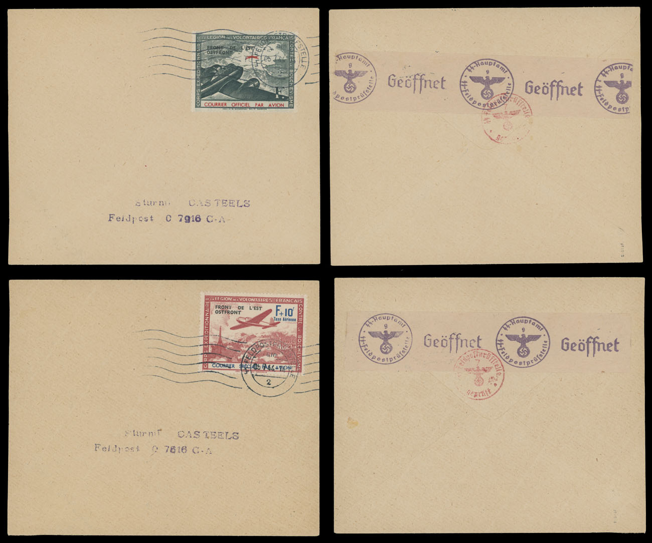1942, black two-line overprints ”FRONT DE L’EST. OSTFRONT” on F(+10fr) greenish black and red, F+10fr brownish red and blue, used on individual Fieldpost covers, censorship tape on reverse, VF, each one expertized by Tust, Mi #IV-V, Est. $200-$250