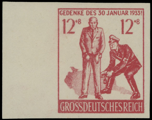 1945(?), Remember 30th January 1933! (the date when Hitler was appointed as Chancellor of Germany), Himmler kicks bound civilian in the shins, 12+8(pf) red, left sheet margin imperforate single (parody of the Munich March stamp of 1944, Mi #906), full OG, NH, VF, Mi#32B, C.v. €800, Est. $500-$600