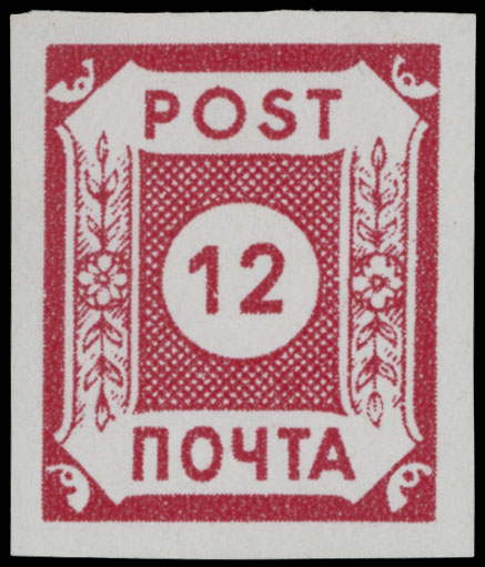1945, Numerals inscribed ”Pochta”, 12pf red, ”thorn” on the lower leaf of ornament on the left, full OG, NH, VF and rare, neat ”D” handstamp on the back, Mi #BI PFI, C.v. €800, Est. $300-$400, Scott #15N1 var