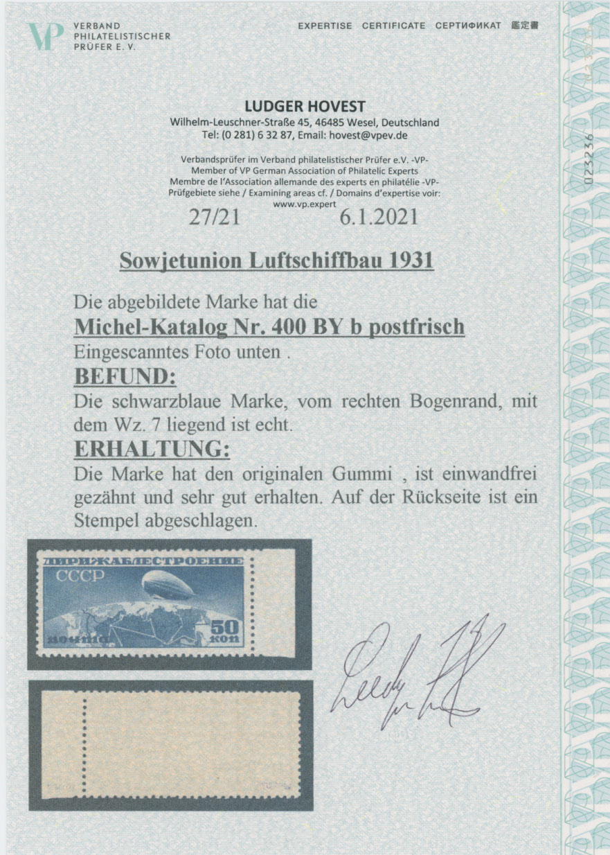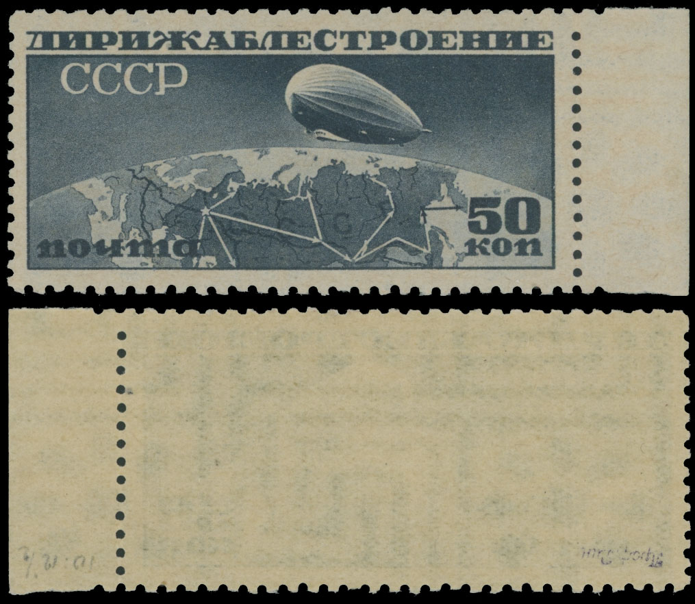 1931, Airship over the Arctic Region, 50k dark gray blue, error of color, right sheet margin single with comb perforation 10½x12, horizontal watermark Borders and Rosettes, nice centering, full OG, NH, VF, L. Hovest certificate, C.v. $900, Est. $600-$700, Scott #C23a
