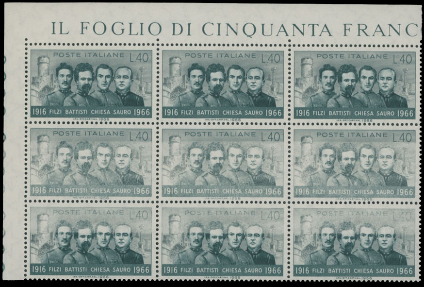 1966, Italian Patriots, 40L bluish green, top left corner margin block of nine, middle and top half of the bottom horizontal rows are strongly underinked, full OG, NH, VF and scarce multiple, a copy of E. Diena certificate for the similar error in block of 16 is enclosed, Cat. Enciclopedico Italiano #1048a, C.v. €10,500, Est. $600- $700, Scott #945 var