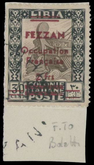 1943, red surcharge ”FEZZAN. Occupation Francaise” 2fr on 30c red and brown, cancelled on a piece, fresh and VF, expertized by A. Bolaffi, Sassone #4, C.v. €1,400, Est. $250-$300