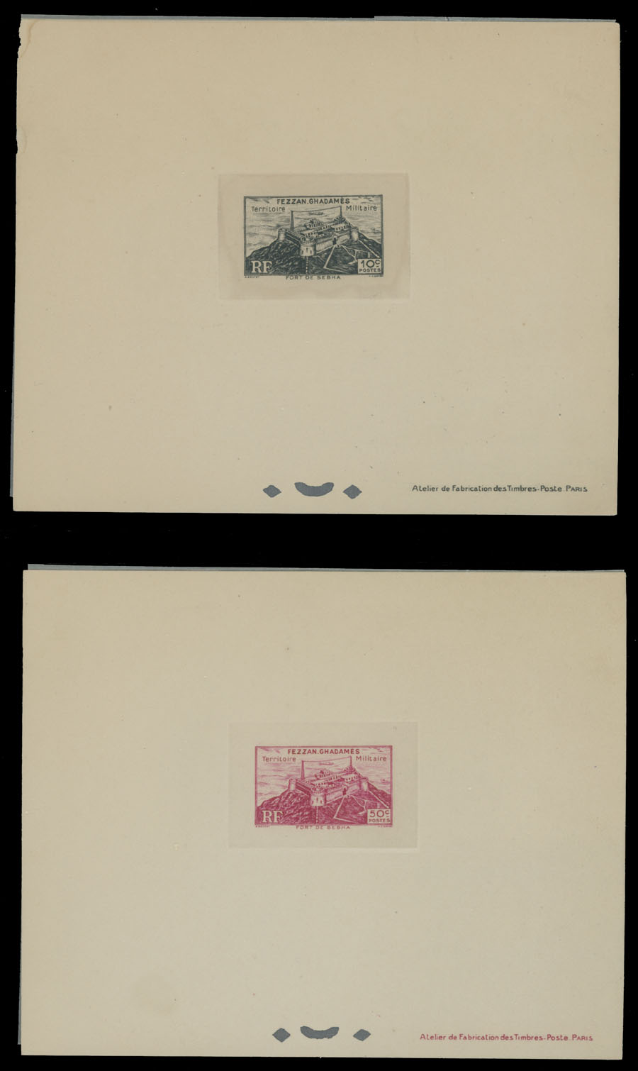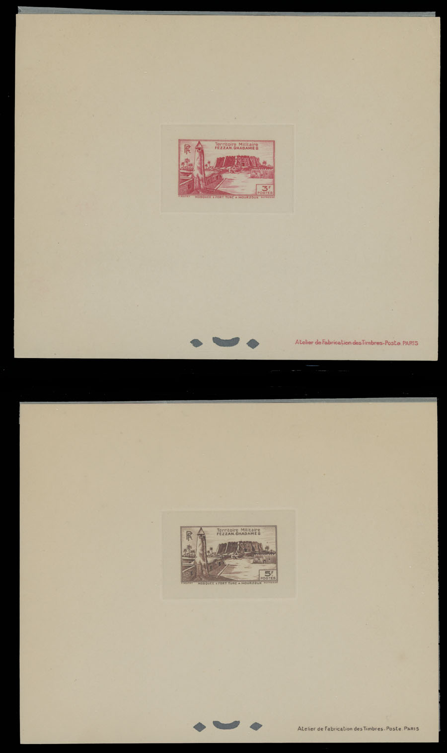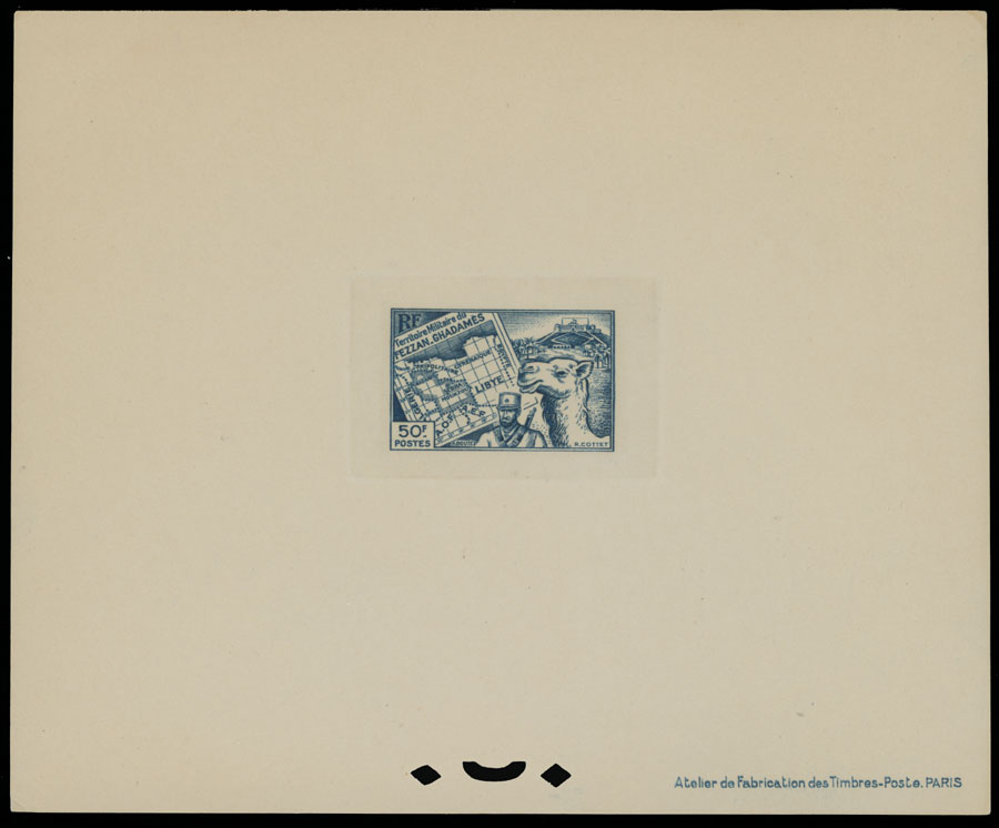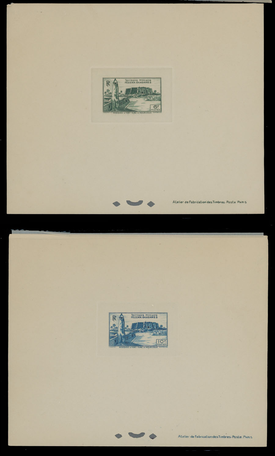 1946, Sebha Fort, Mosque, Map and Camel, 10c-50fr, complete set of 15 die sunk epreuves de luxe, each one with protected paper, appropriate punctures and text at bottom right, no gum as produced, NH, VF and rare, only a few complete sets were produced, Sassone #1-15, Est. $500-$600, Scott #1N1-15