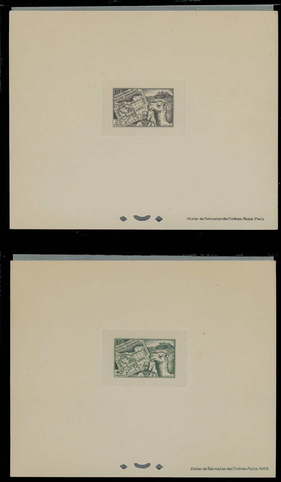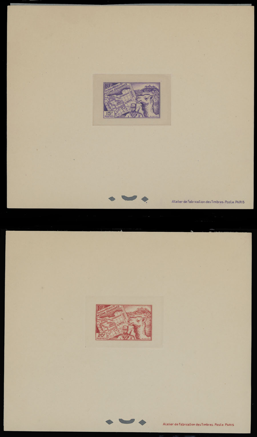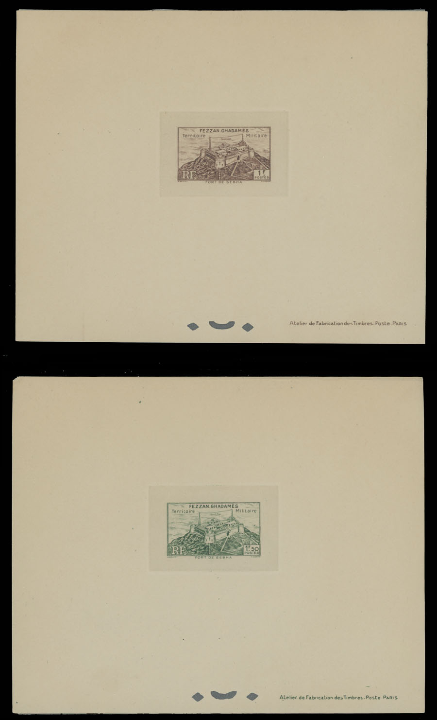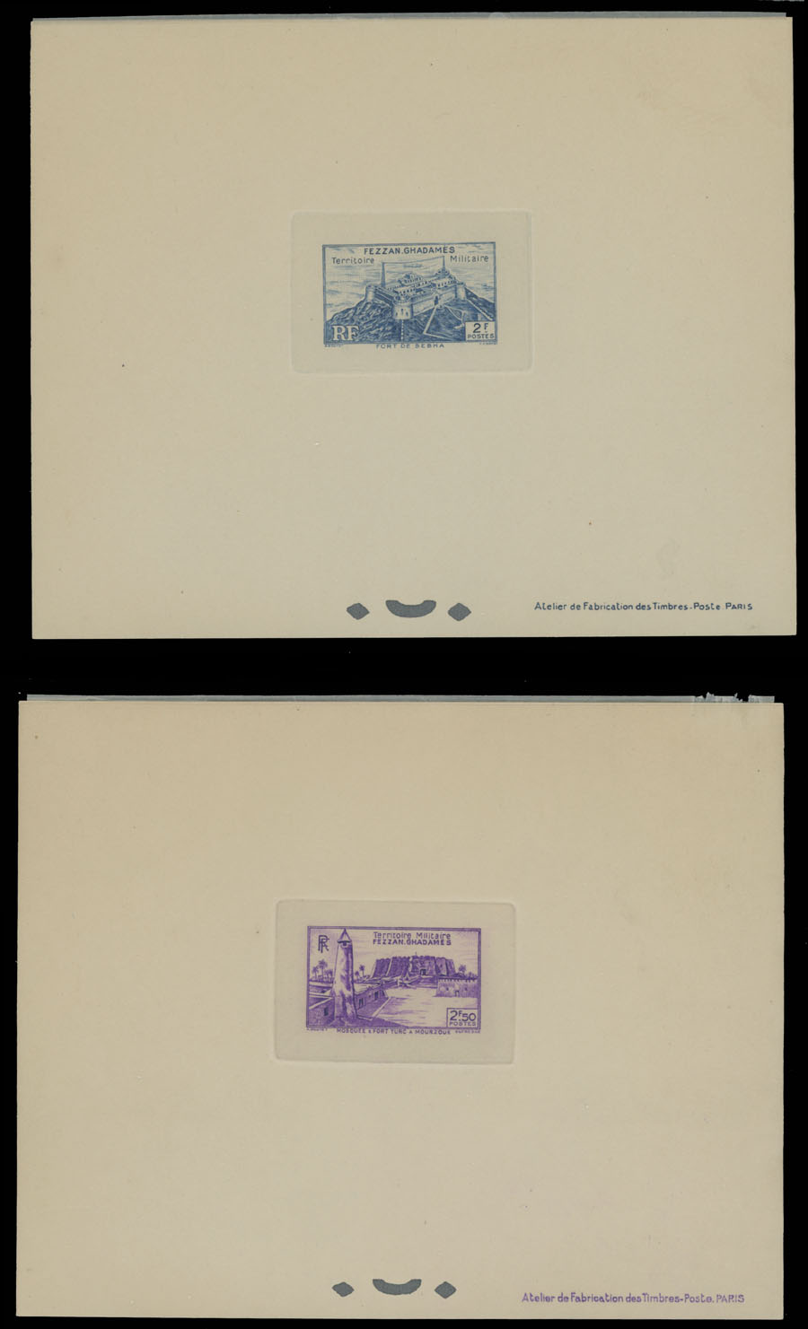 1946, Sebha Fort, Mosque, Map and Camel, 10c-50fr, complete set of 15 die sunk epreuves de luxe, each one with protected paper, appropriate punctures and text at bottom right, no gum as produced, NH, VF and rare, only a few complete sets were produced, Sassone #1-15, Est. $500-$600, Scott #1N1-15