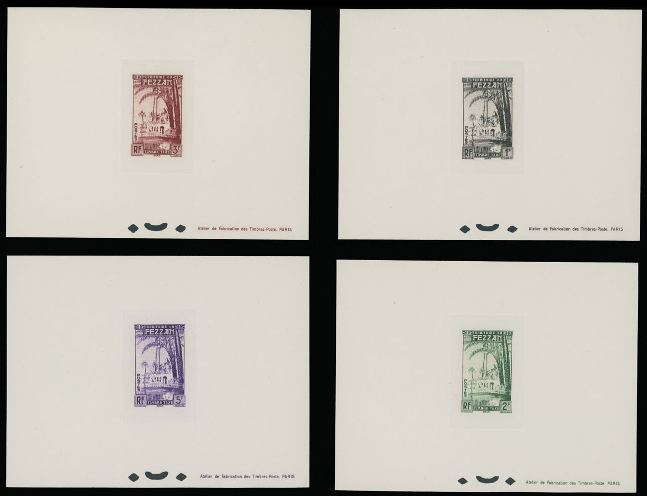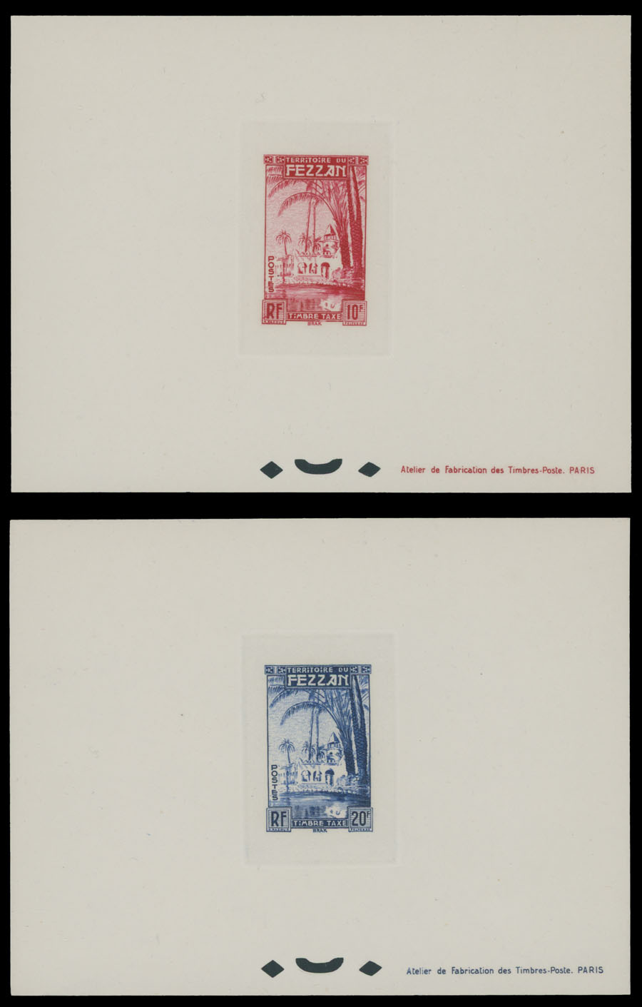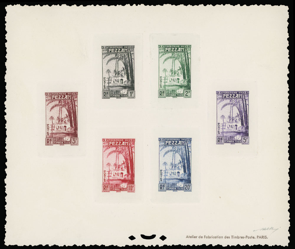 1950, Oasis of Brak, 1fr-20fr, complete set of six die sunk epreuves de luxe and die sunk epreuve de luxe collective of the complete set, all with punctures at bottom and text at lower right, no gum as issued, NH, VF and rare group, Sassone #SEG1-6, Est. $600-$800, Scott #2NJ1-6