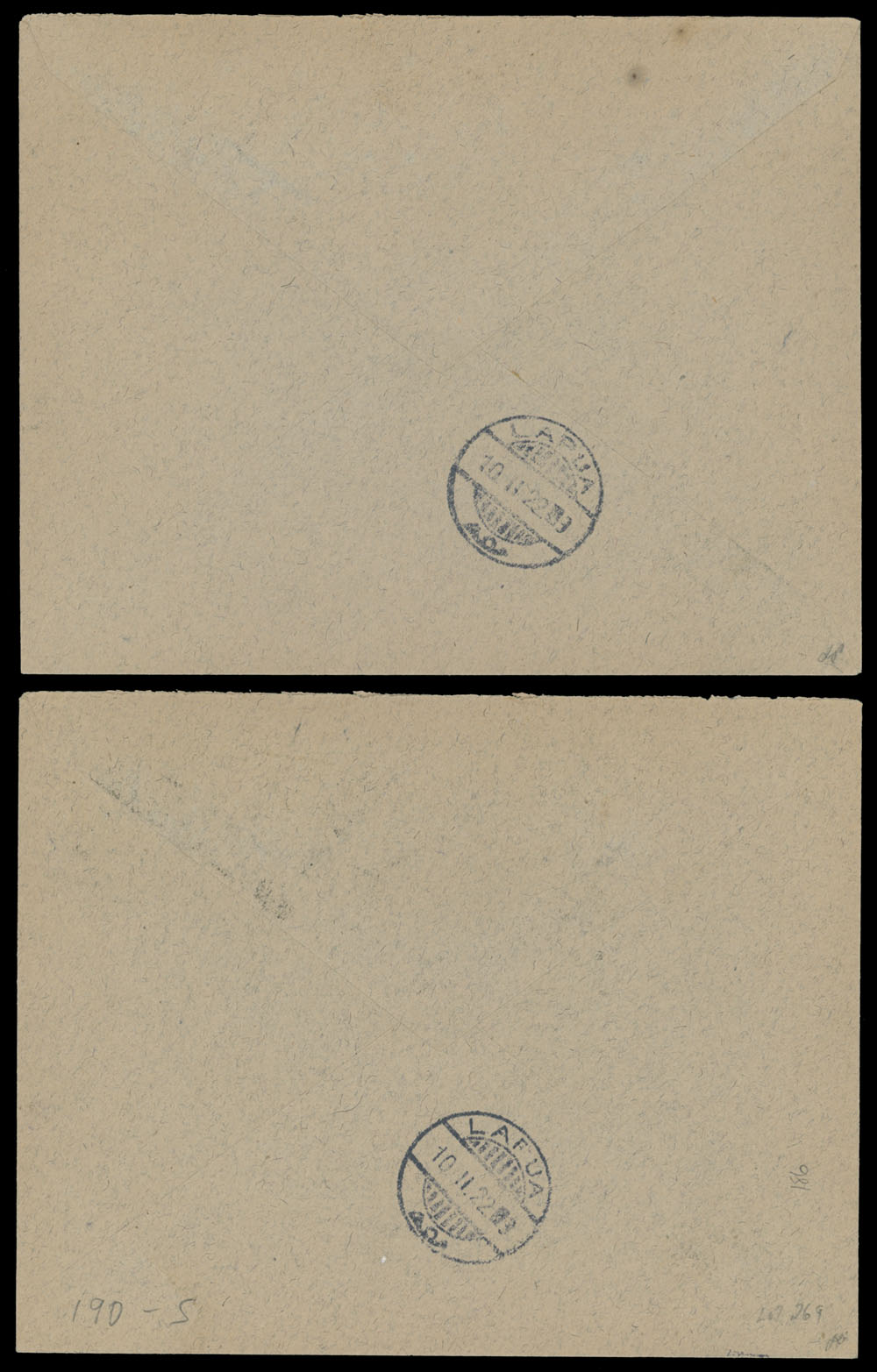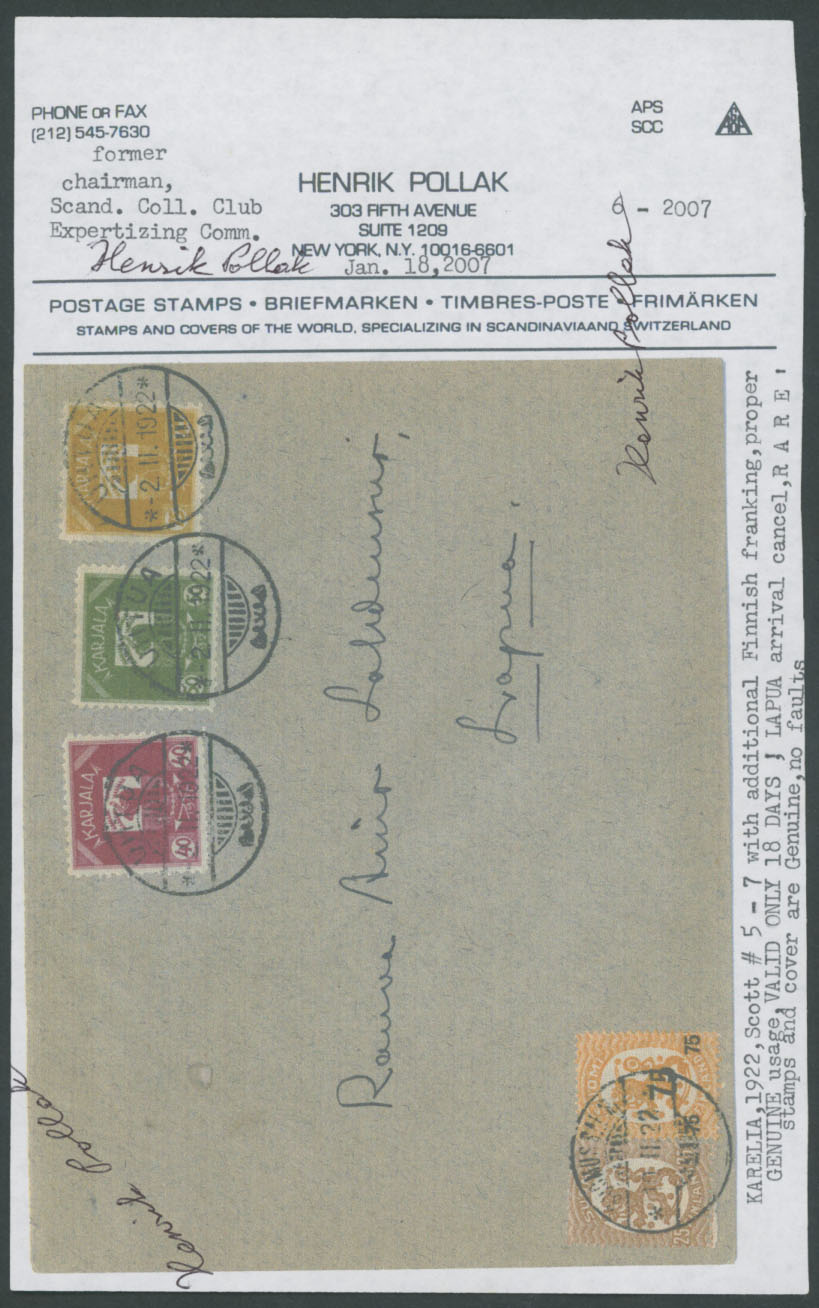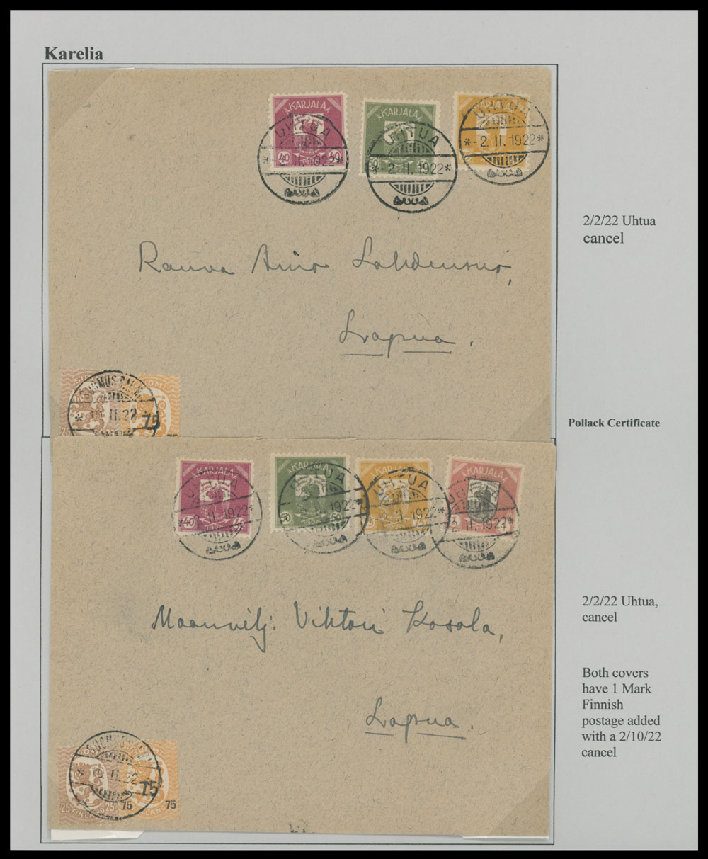 1922 (February 2), two mixed franking covers to Lapua, bearing three or four Bear stamps, cancelled by Uhtua ”2.II.20” date stamps, upon arrival to Suomussalmi uprated by two Finnish adhesives and tied by ”10.II.22” postal marking, the same day Lapua receiver is on the back, arranged on page from the Collection, VF, one with H. Pollak certificate, Est. $800-$900, Scott #4-6, 8