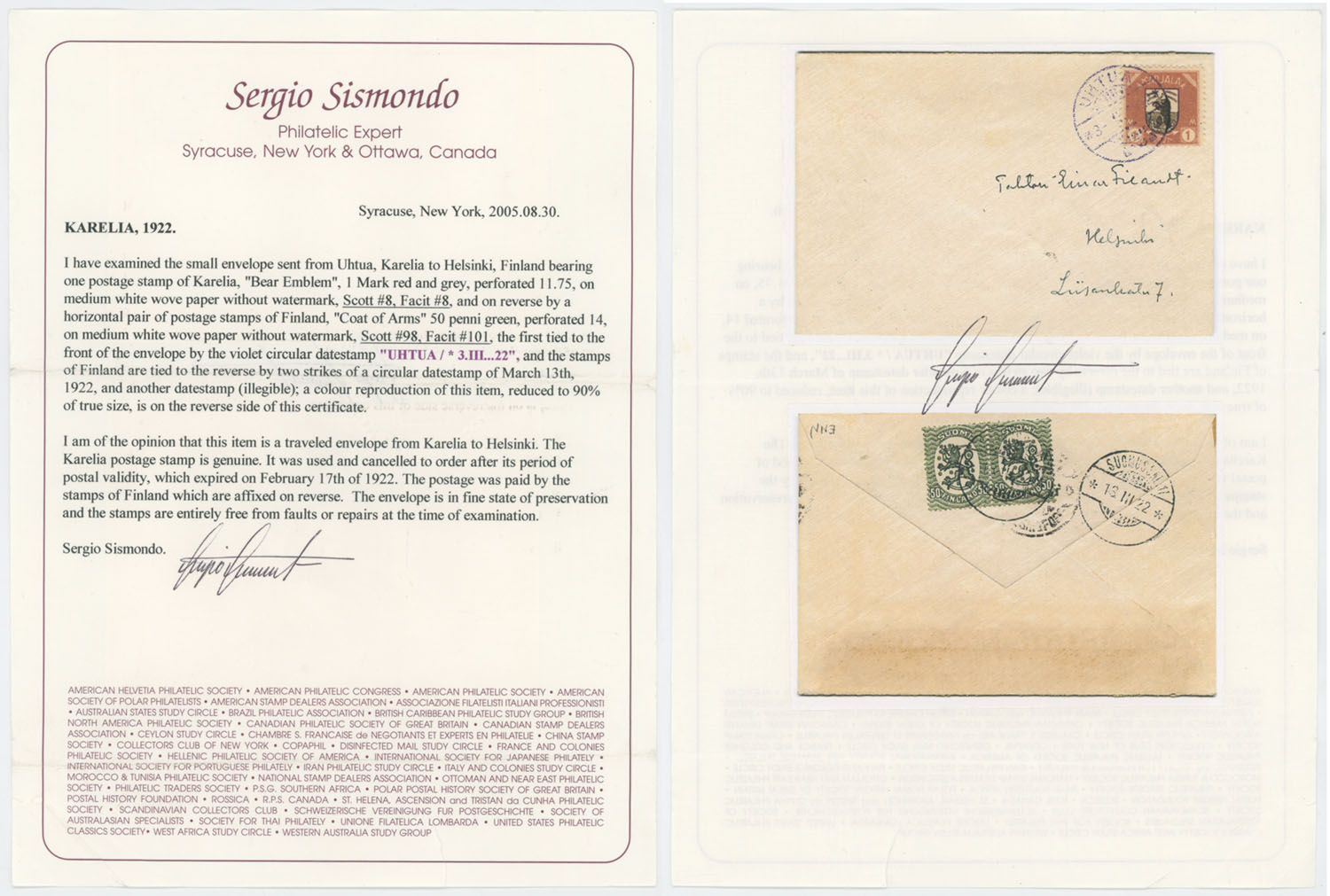 1920 (February 3), reduced size registered cover to Helsinki, franked by seven Bear stamps, Suomussalmi transit and Helsinki arrival marking; in addition solo franking of 1m on cover from Uhtua dated March 3 (late usage), uprated by two Finnish stamps on reverse and received in Helsinki on March 13, both arranged on page from a Collection, F/VF, the last one with S. Sismondo certificate, Est. $600-$700, Scott #1-8