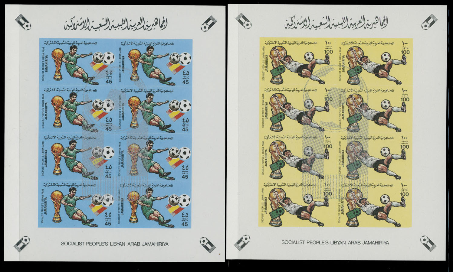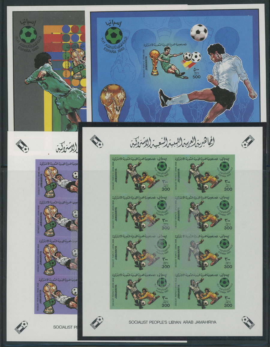 1982, World Soccer Championships, 45d-300d, imperforate complete set of four, miniature sheets of eight and two imperforate souvenir sheets of 500d, sheetlets with marginal inscription and soccer ball overprint in silver, souvenir sheets with Arabic overprint in green on reverse, full OG, NH, VF and scarce, these imperfs were produced in very limited quantity, Est. $150-$200, Scott #1016-19, 1020-21 imp