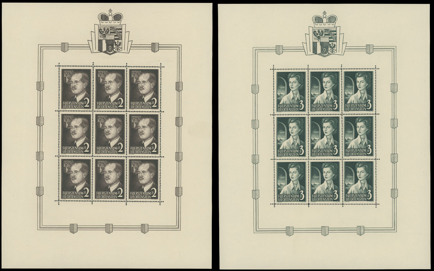 1955, Prince Franz Joseph II and Princess Georgina, 2fr dark brown and 3fr dark green, complete set of two on cream paper in sheets of nine, full OG, NH, VF, C.v. $1,260++, SBK #276-77, C.v. CHF3,750, Est. $600-$700 , Scott #287-88