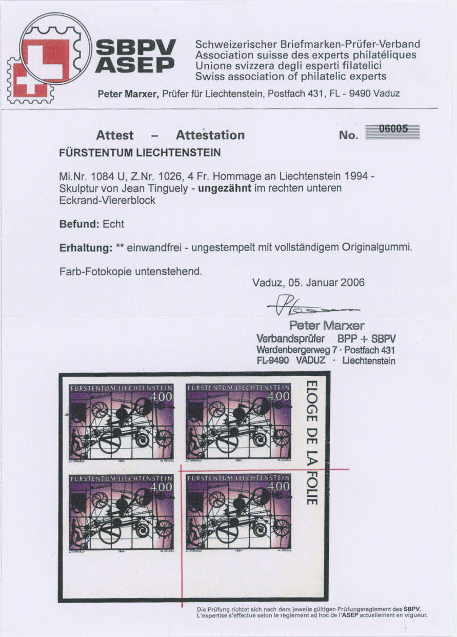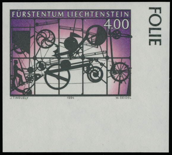 1994, Mobile by Jean Tinguely, 4fr multicolored, bottom right corner sheet margin imperforate single, full OG, NH, VF and very rare, this stamp is not listed in Scott, P. Maxer certificate for bottom right corner margin block of four, SBK #1026U, C.v. CHF2,500, Est. $800-$1,000, Scott #1024 imp