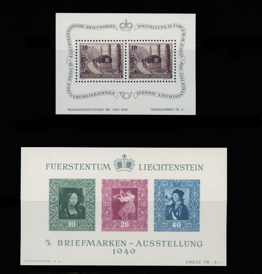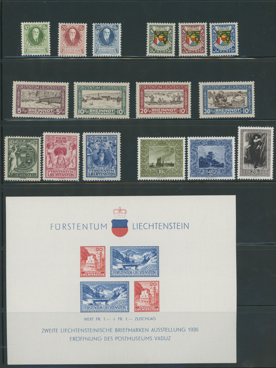 NEAT SELECTION: 1925-51, 16 mint stamps and 3 souvenir sheets, including Prince Johann II, Aid to Rhine Flood Victims, 5th Philatelic Exhibition souvenir sheet (considered semi-postal issue by Liechtenstein Cat.), all with full OG, NH, VF, SBK #W1/26, C.v. CHF1,390, Est. $200-$250, Scott #B1/21, 238