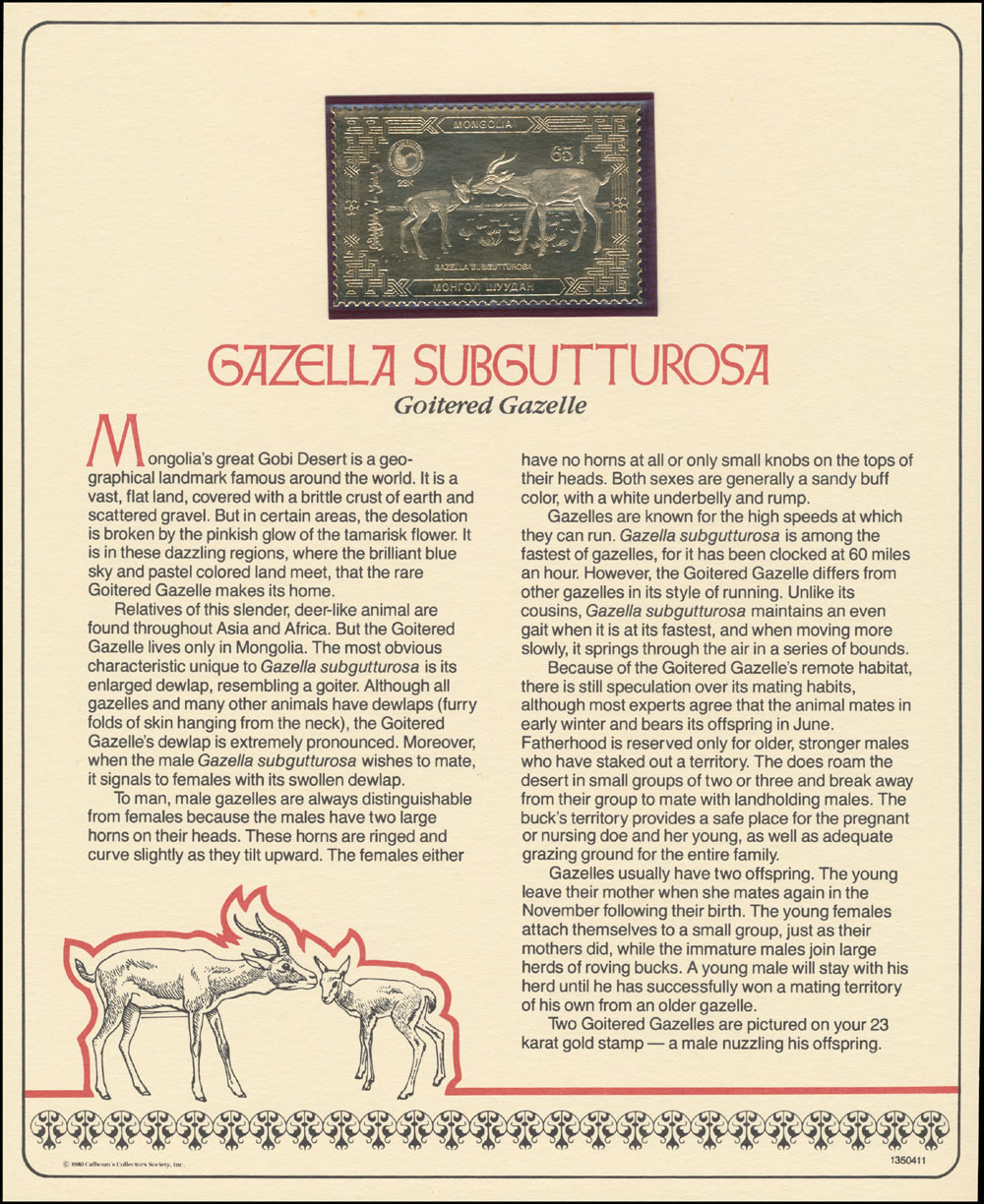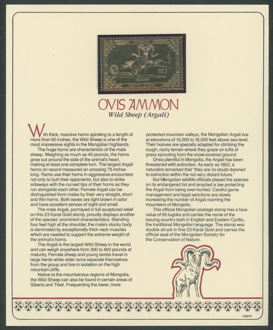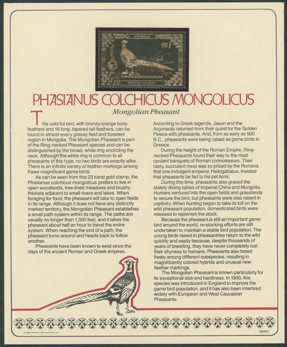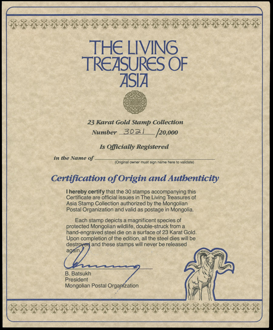 1980-82, ”The Living Treasures of Asia”, green leather cover book contains 30 pages, each page is bearing 65m stamp printed on 23k gold foil, picturing animals or birds living in Mongolia, complete set of 30, perfect condition, NH, VF, included official certificate and advertising booklet, Est. $400-$500