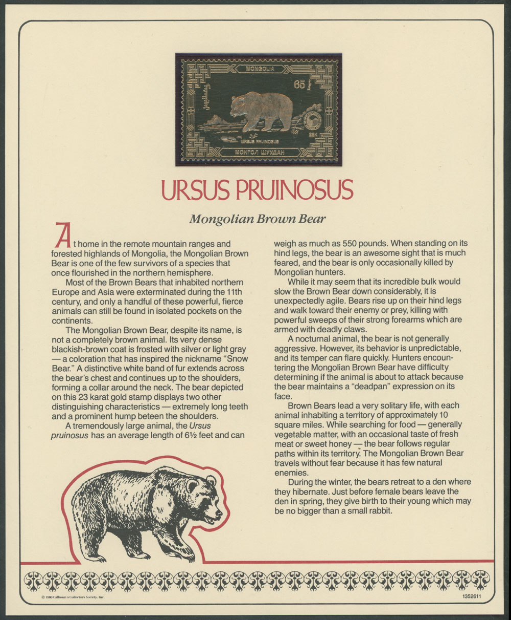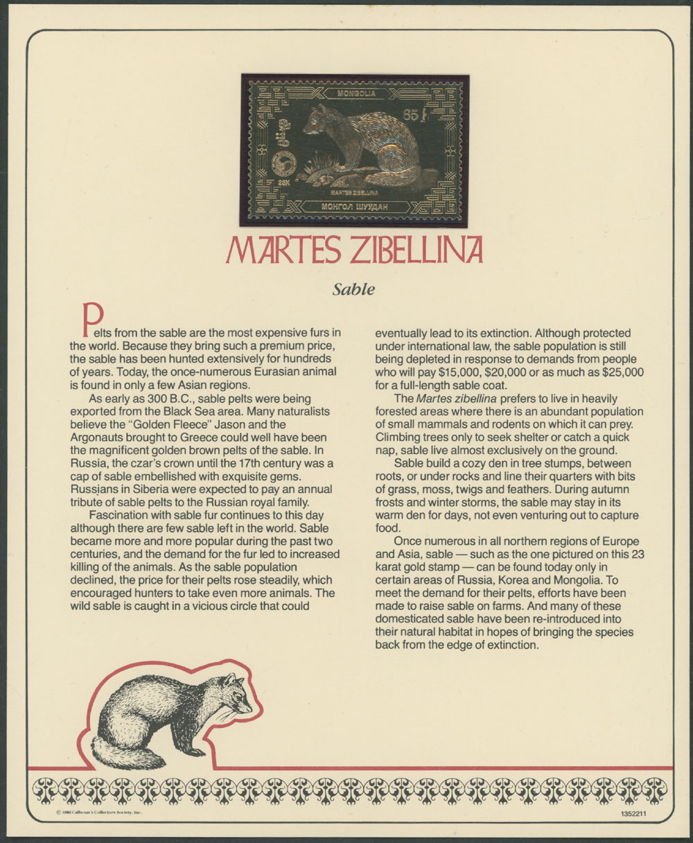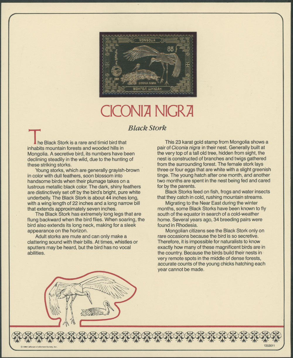 1980-82, ”The Living Treasures of Asia”, green leather cover book contains 30 pages, each page is bearing 65m stamp printed on 23k gold foil, picturing animals or birds living in Mongolia, complete set of 30, perfect condition, NH, VF, included official certificate and advertising booklet, Est. $400-$500