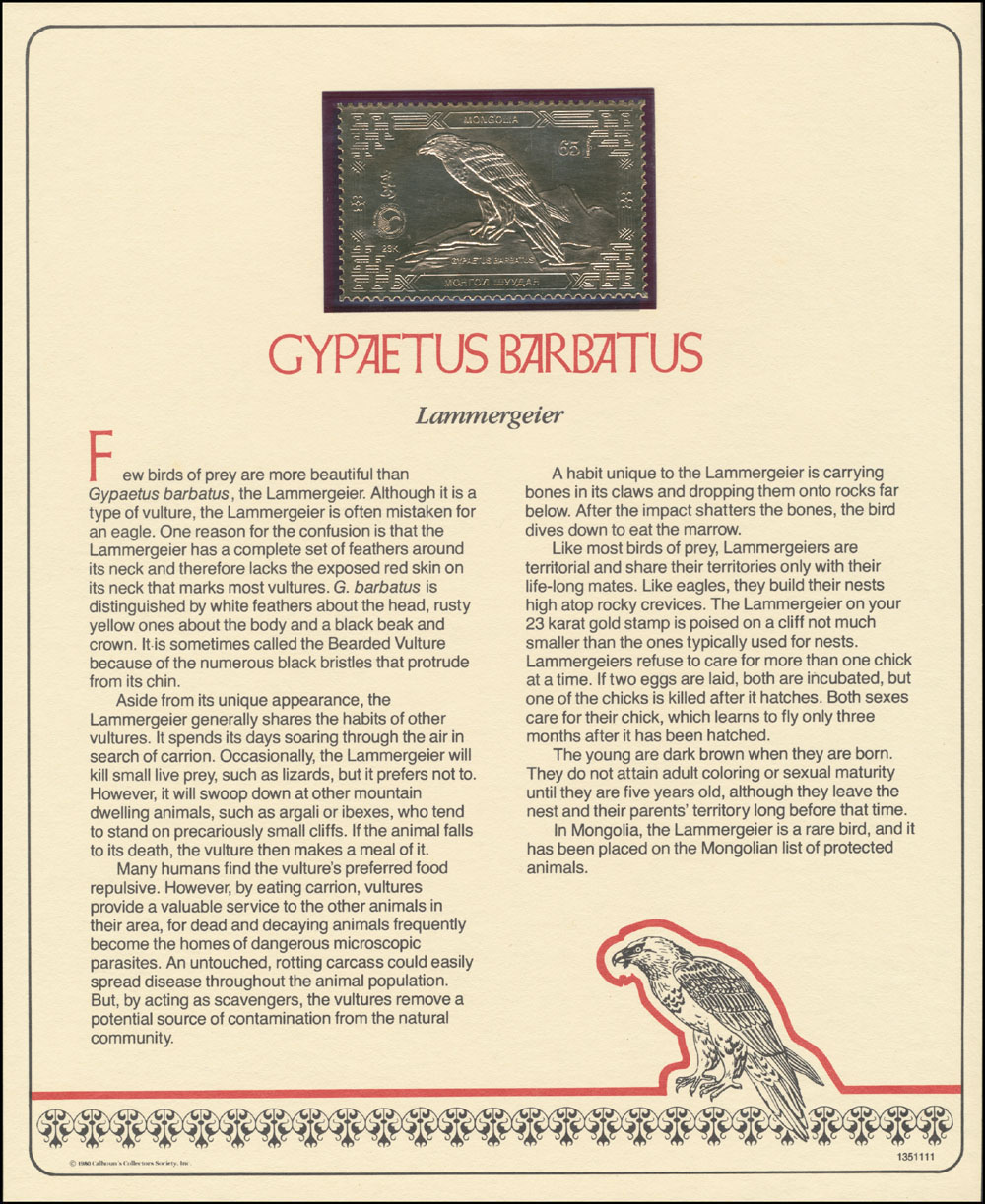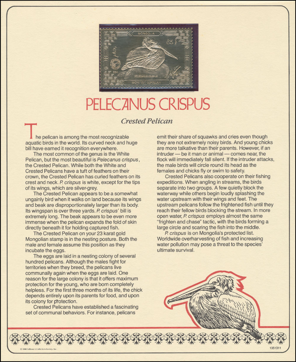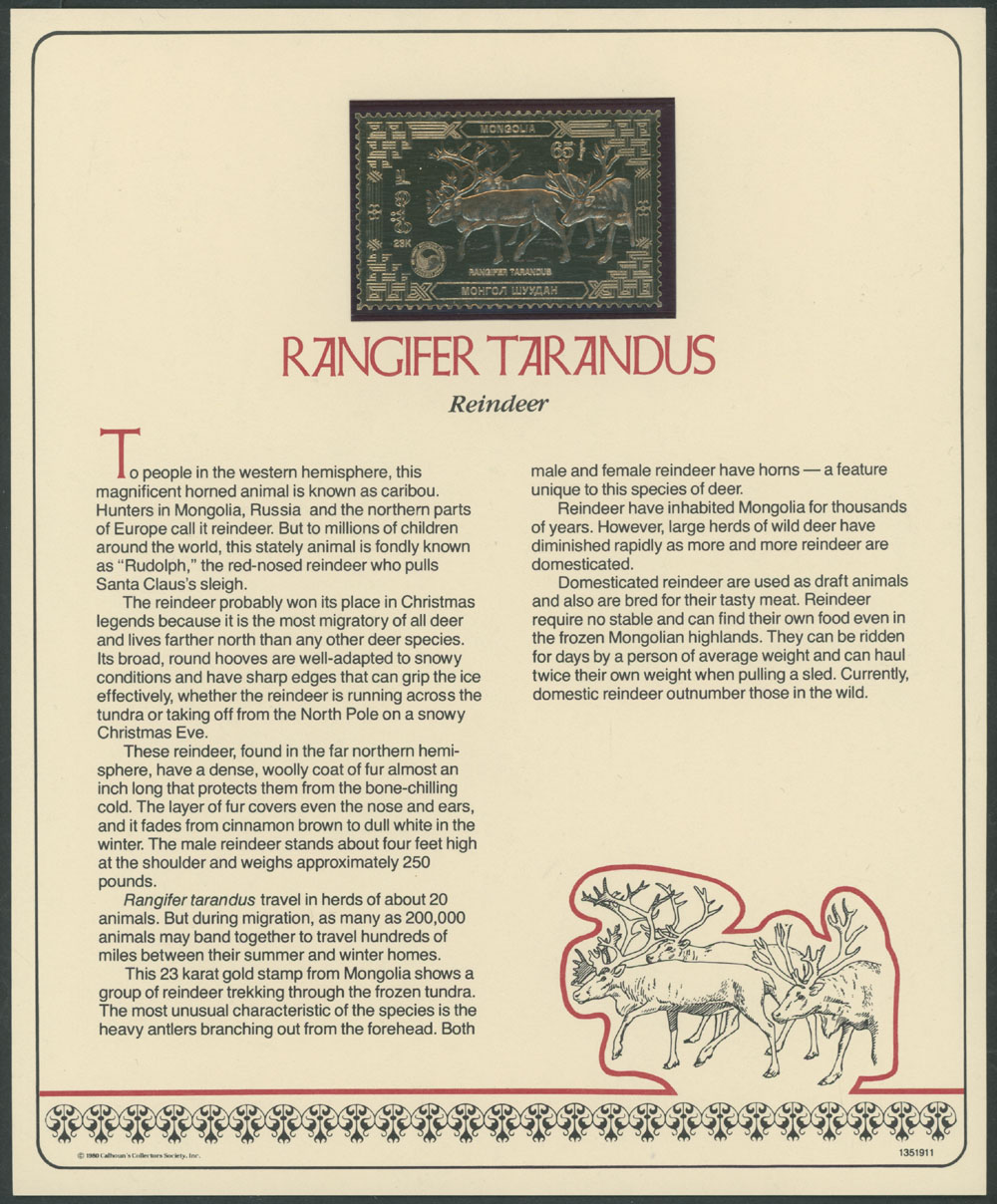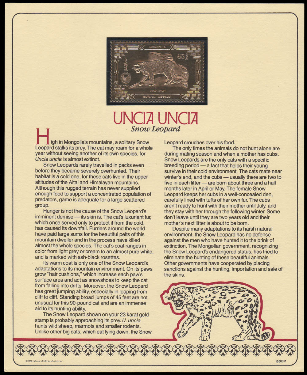 1980-82, ”The Living Treasures of Asia”, green leather cover book contains 30 pages, each page is bearing 65m stamp printed on 23k gold foil, picturing animals or birds living in Mongolia, complete set of 30, perfect condition, NH, VF, included official certificate and advertising booklet, Est. $400-$500