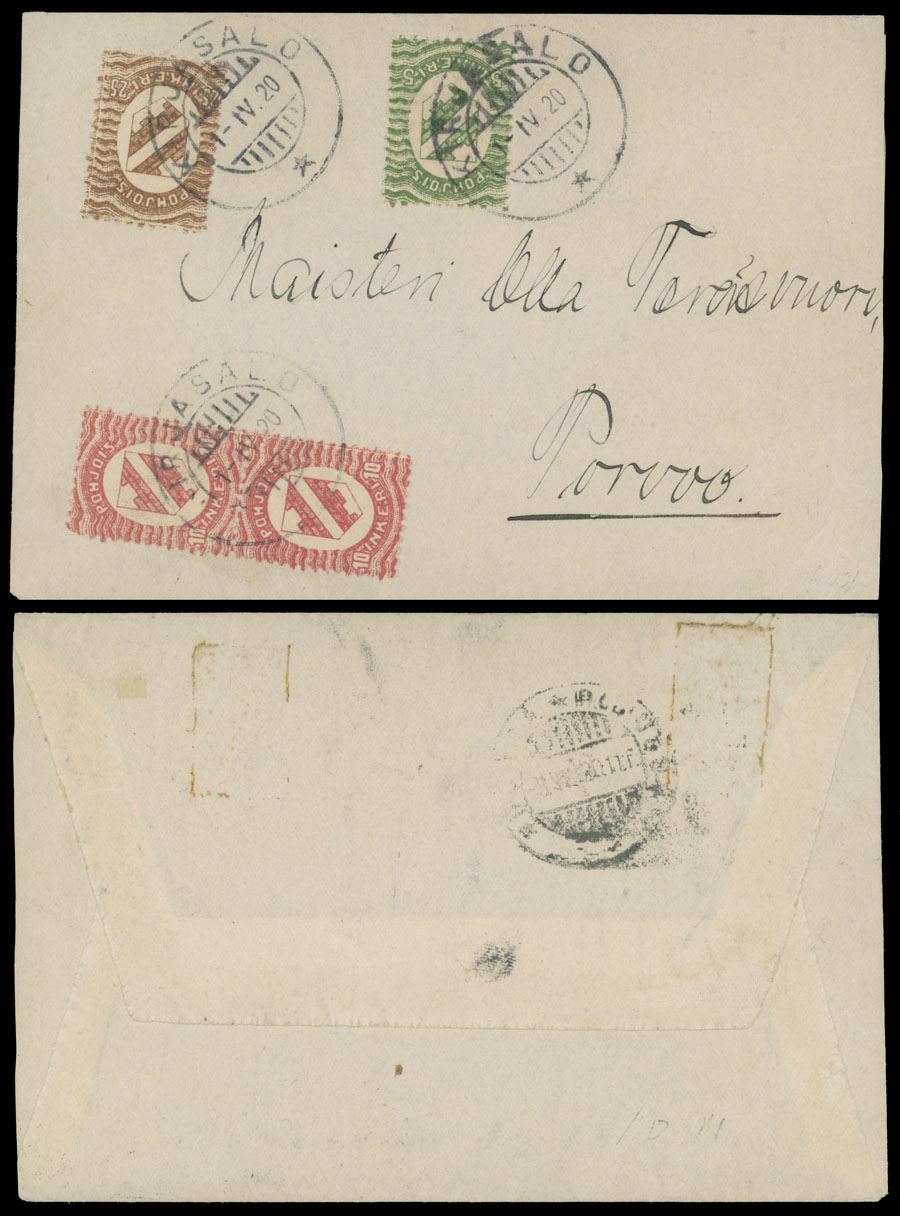 1920 (April 1), cover to Povoo, franked by four Arms stamps, tied by Kirjasalo ”1.IV.20” postmark, Porvoo ”3.IV.20” arrival ds, mostly VF and rare, Est. $300-$350 , Scott #1, 2 x2, 3