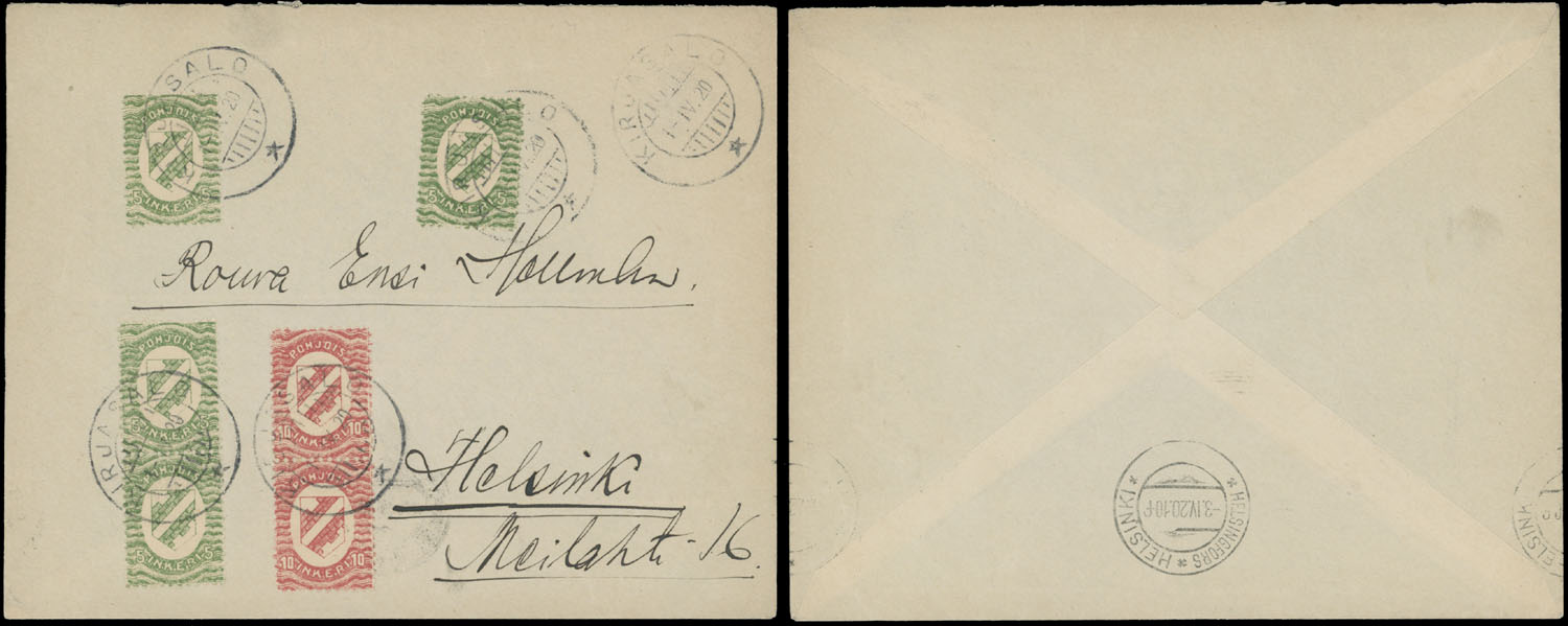 1920 (April 1), Coat of Arms, two singles of 5p and pairs of 5p and 10p, six stamps altogether used on cover to Helsinki, tied by Kirjasalo postmark, Helsinki ”3.IV.20” arrival ds on reverse, VF and rare, Est. $300-$350 , Scott #1 x4, 2 x2