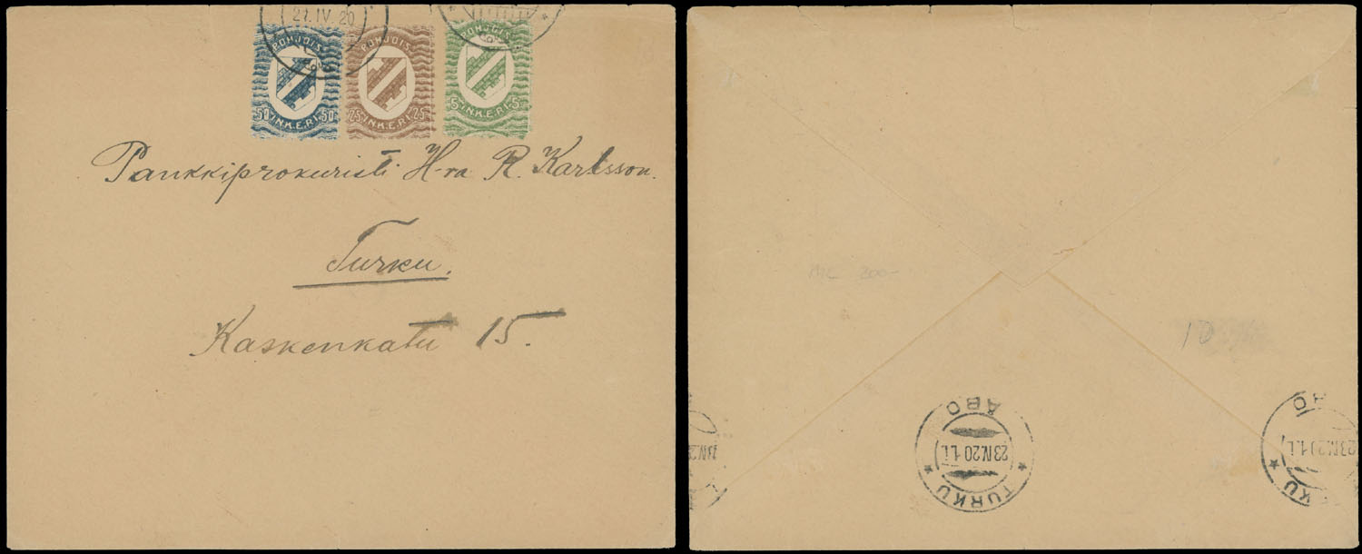 1920 (April 21), Coat of Arms, 5p green, 25p brown and 50p blue, three stamps paying for delivery of cover from Kirjasalo to Turku, postmarked on arrival on April 23, minor wearing, still F/VF, Est. $200-$250 , Scott #1, 3, 4