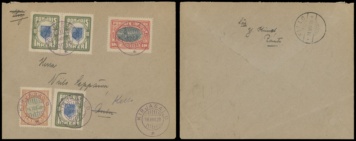 1920 (August 16), cover from Kirjasalo to Kello, franked by five pictorial valies – pair and a single of 10p plus singles of 30p and 1m, appropriately cancelled, Kello ”27.VIII.20” arrival ds on reverse, mostly VF, Est. $250-$300 , Scott #8 x3, 9, 12