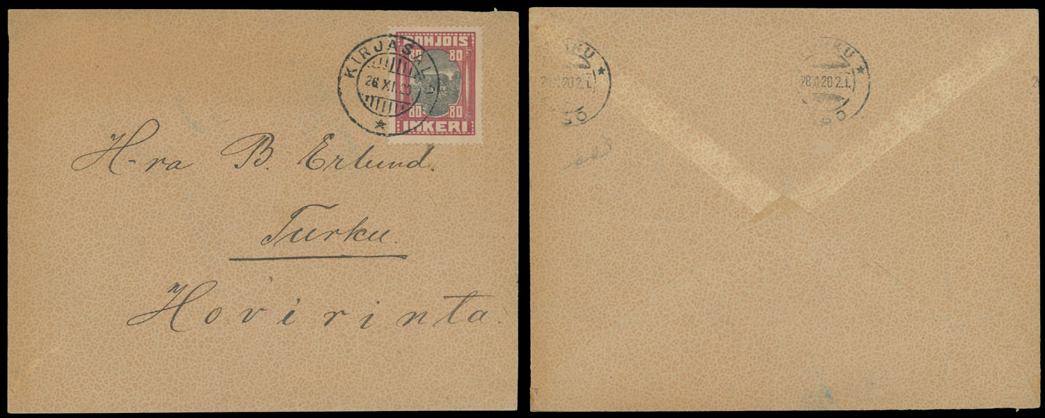 1920 (September 26), cover from Kirjasalo to Turku, franked by single pictorial stamp of 80p claret and gray, met appropriate postal rate applied in August, Turku ”28.IX.20” machine arrival ds on reverse, VF, Est. $300-$400 , Scott #11