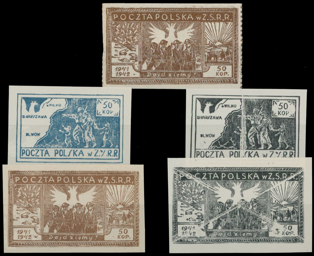 1942, Dojdziemy, 50k red brown, a single with full OG, NH, VF, expert sign on reverse, in addition two reprints of the first unissued stamp (rejected by Soviets) and two of the Dojdziemy issue, a press-clip shown presentation of these stamps by Polish Authorities is included, Est. $250-$300