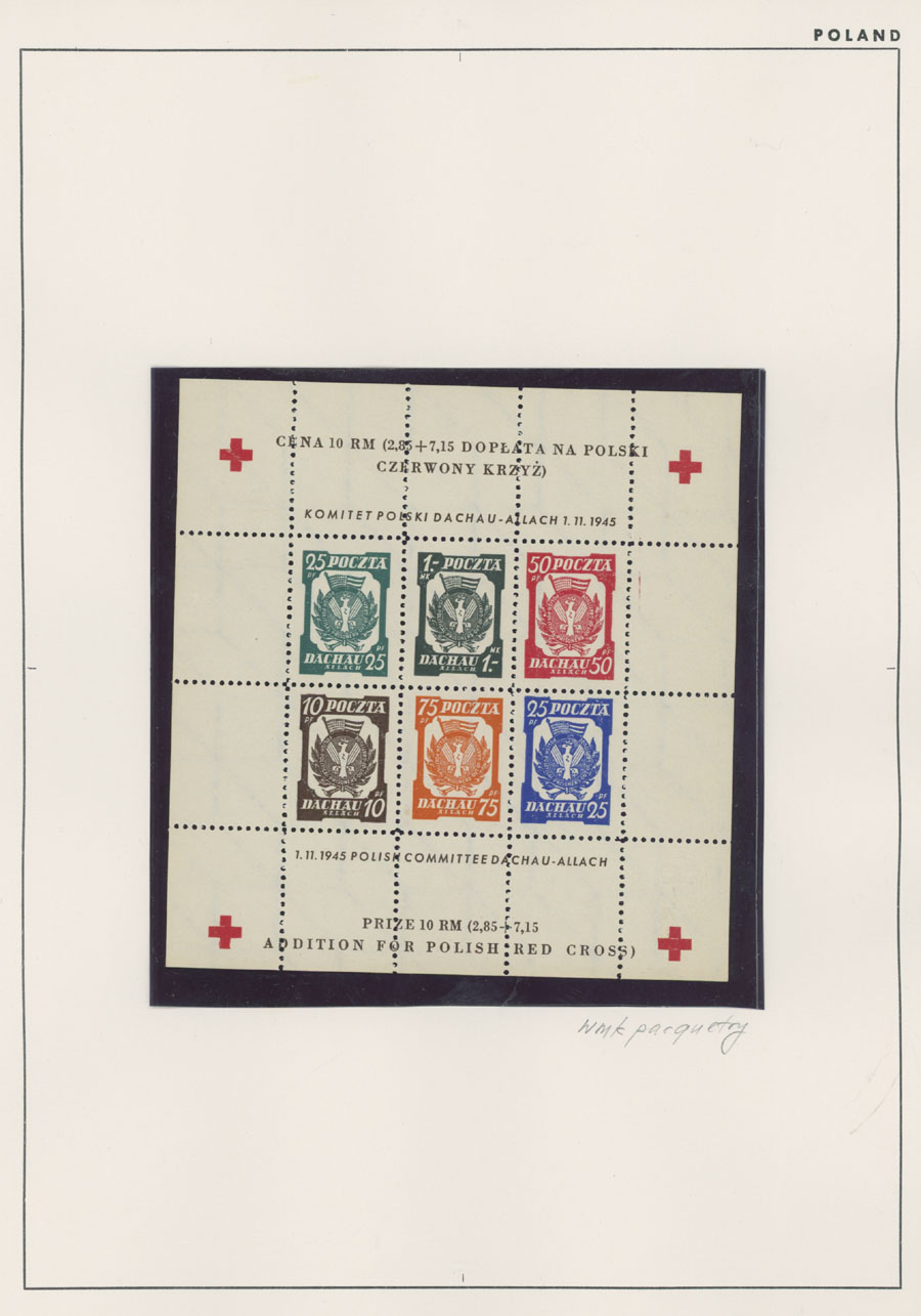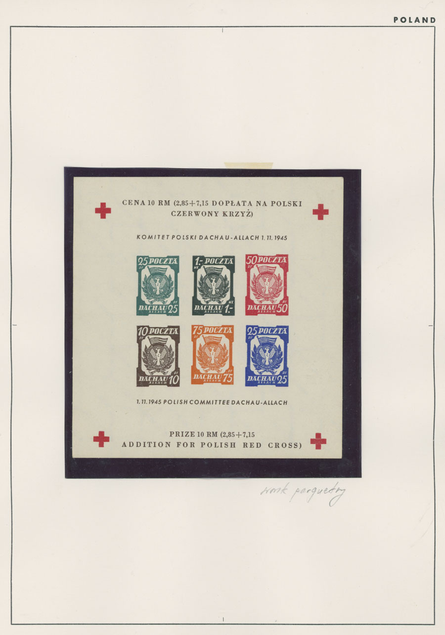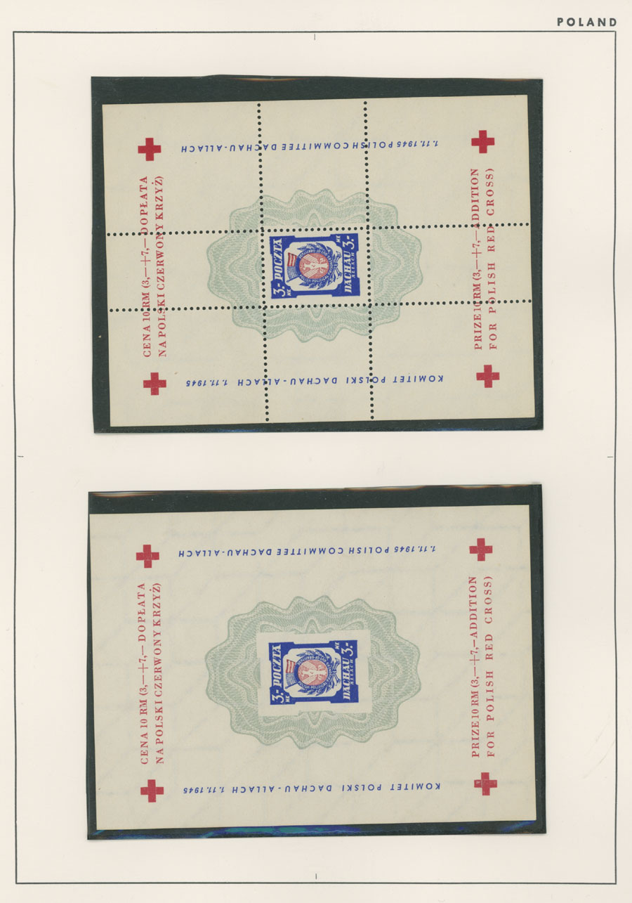 1945-46, Dachau – six perforated stamps (no gum or spare gum), three perforated and two imperforate souvenir sheets (all sheets of six with colorless embossing), Hellbrunn – perforated and imperforate souvenir sheets, arranged on pages, generally fresh and VF, Est. $150-$200