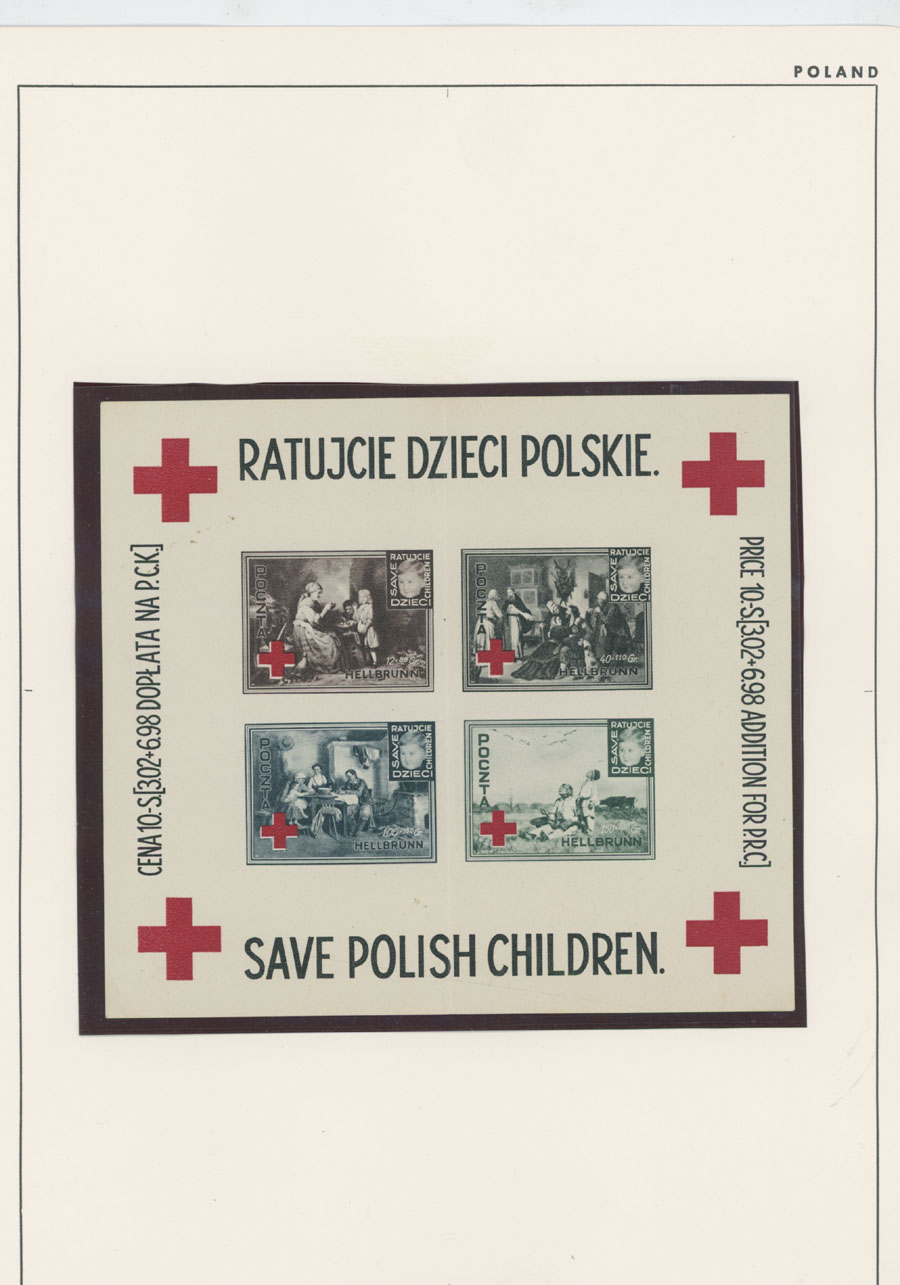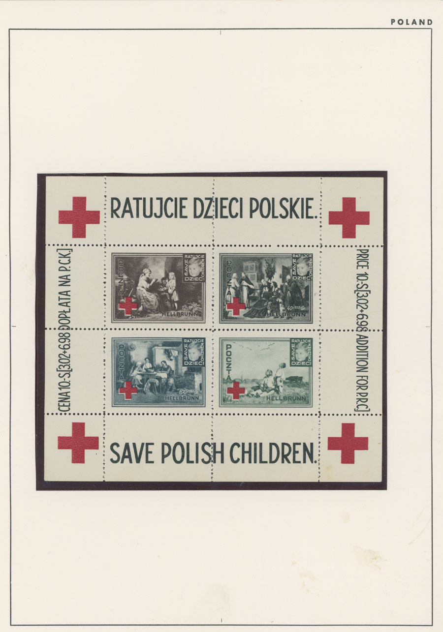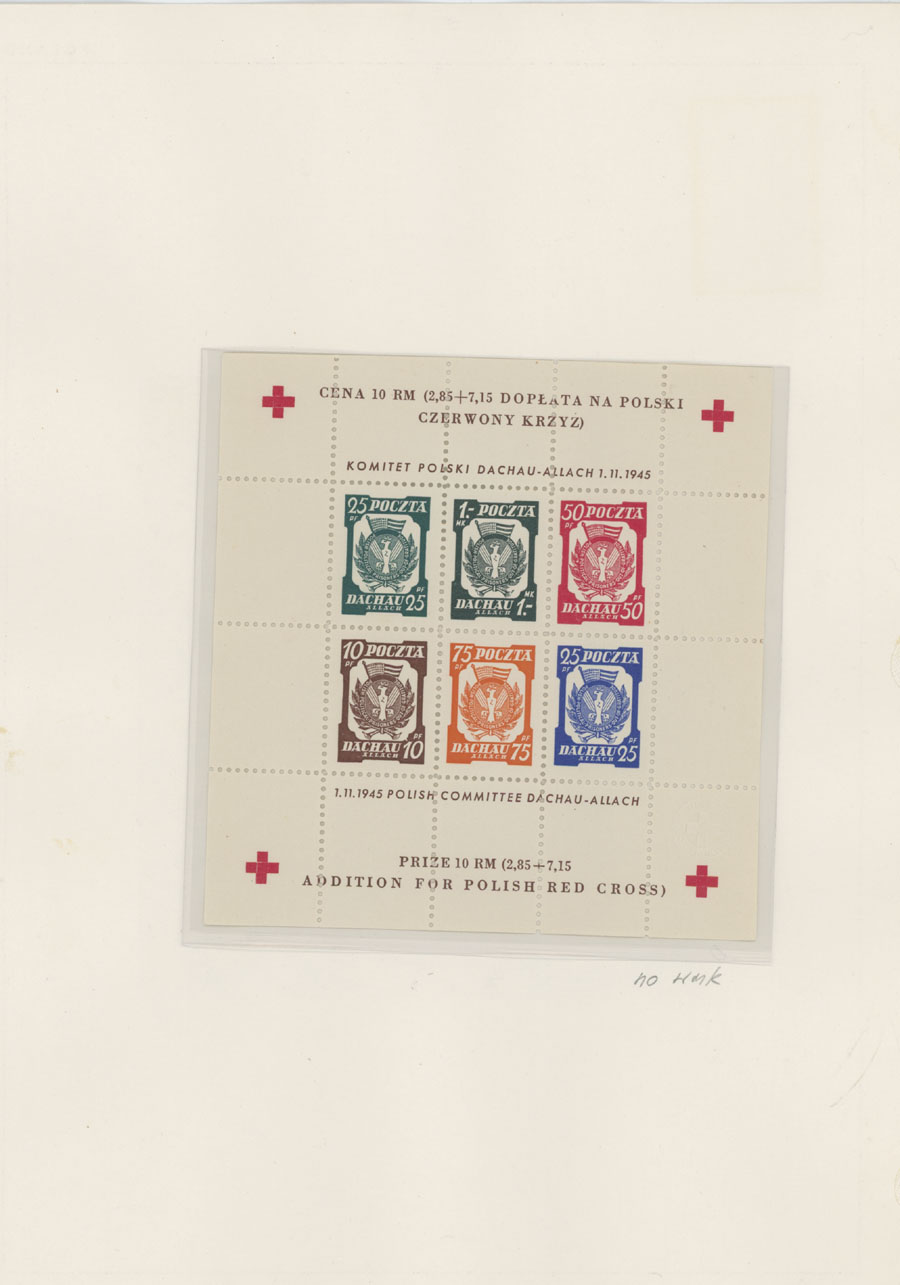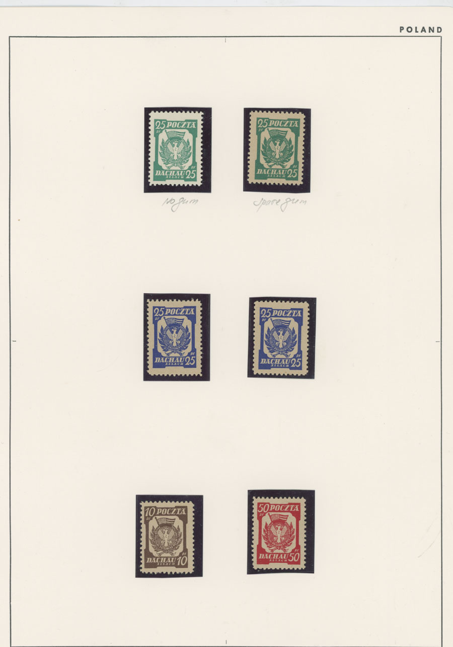1945-46, Dachau – six perforated stamps (no gum or spare gum), three perforated and two imperforate souvenir sheets (all sheets of six with colorless embossing), Hellbrunn – perforated and imperforate souvenir sheets, arranged on pages, generally fresh and VF, Est. $150-$200