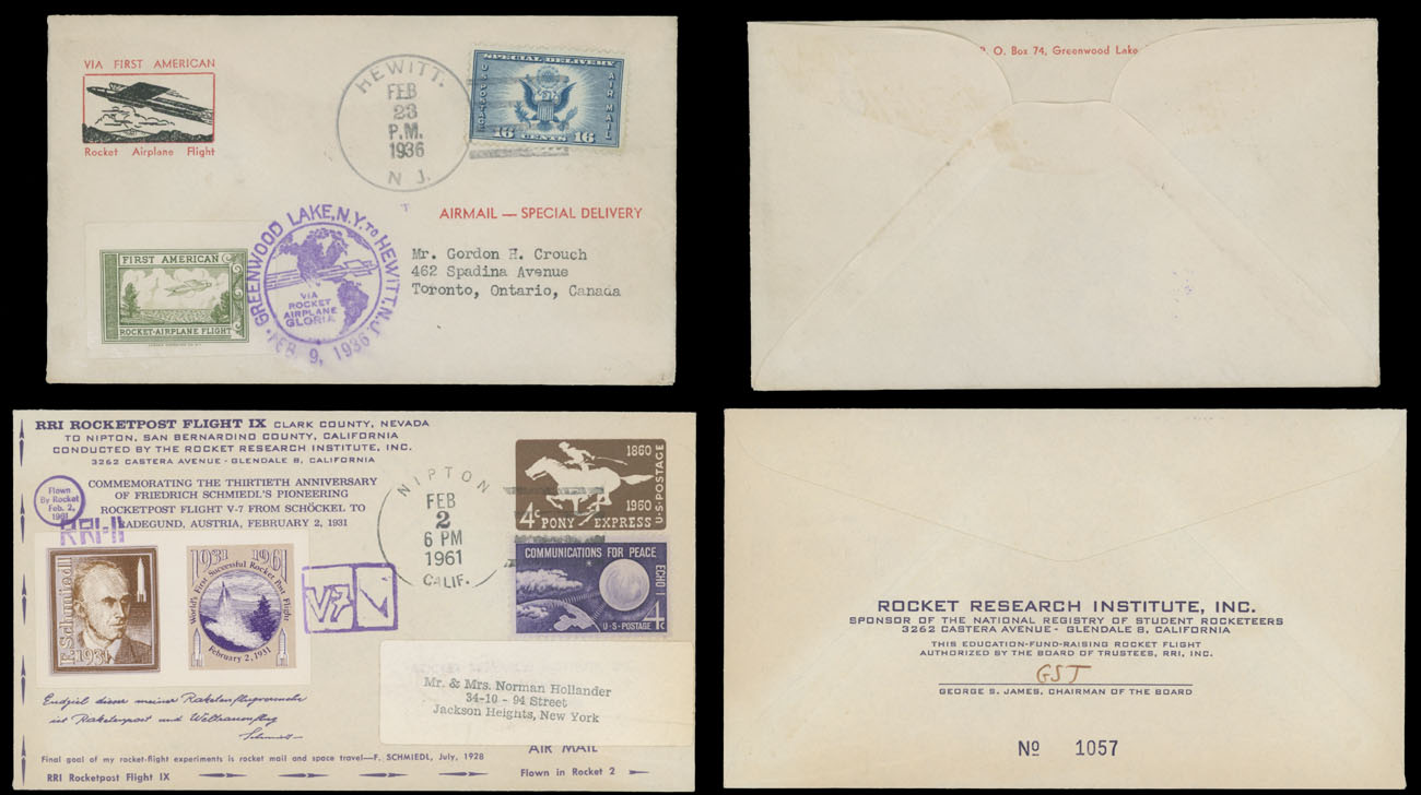 1936 (February 23), Willy Ley Greenwood Lake (NY) Flight cacheted cover, franked by Special Delivery stamp of 16c blue, tied by Hewitt ds, bearing green rocket imperforate stamp cancelled with violet flight marking, in addition cover from RRI Rocket Flight IX commemorating World’s First Successful Rocket Post Flight, VF, Est. $200-$250, Scott #E1