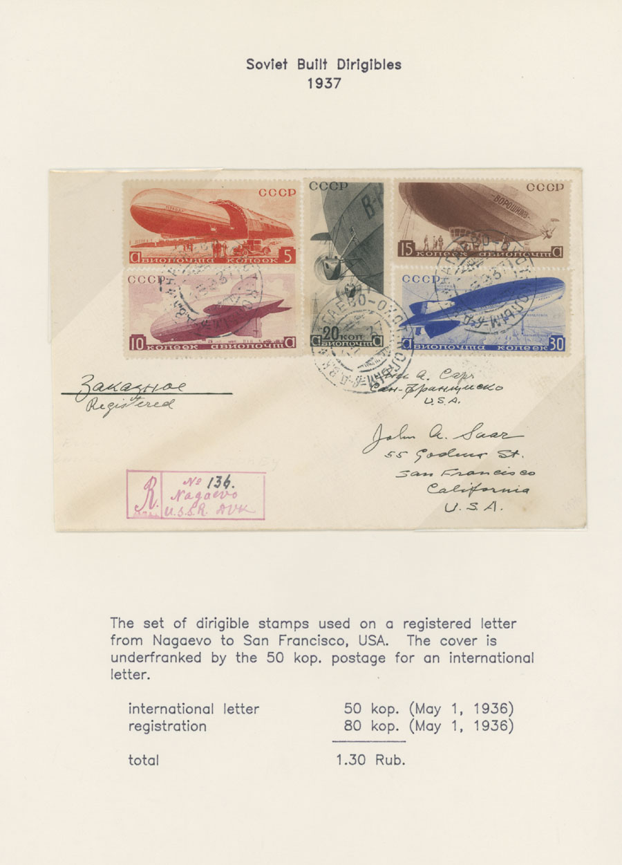 1934, Airships, 5k-30k, complete set of five, used on registered cover from Nagayevo (Far Eastern Kray) to USA in 1937, New York transit and San Francisco arrival ds on reverse, arranged on page from a Collection, VF, Est. $1,000-$1200 , Scott #C53-57