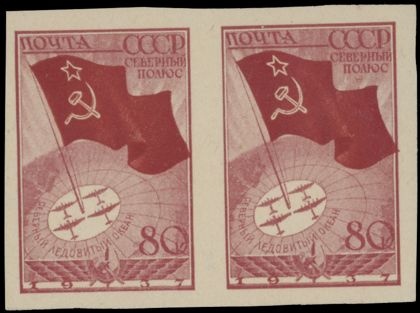 1938, North Pole Flight, 80k carmine, horizontal imperforate pair, balanced margins all around, full OG, NH, VF, J. Belyuga owner’s hs, C.v. $480++, Est. $300-$350 , Scott #628a