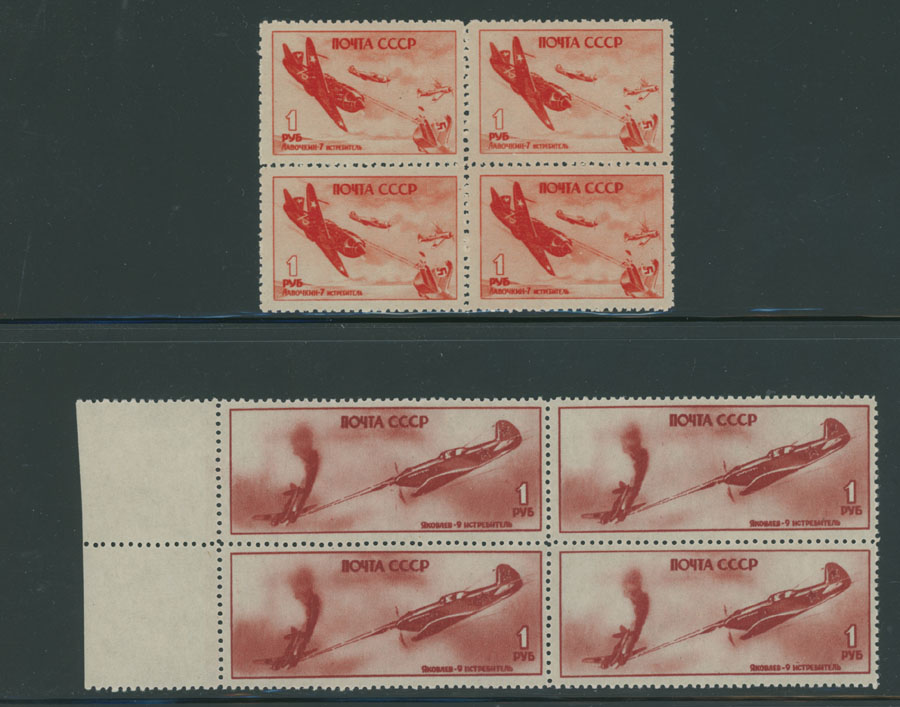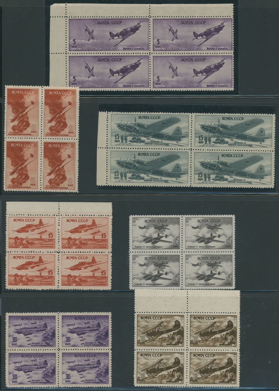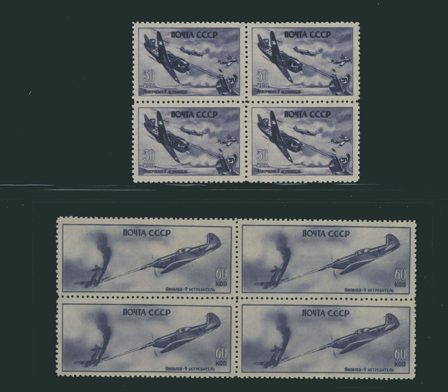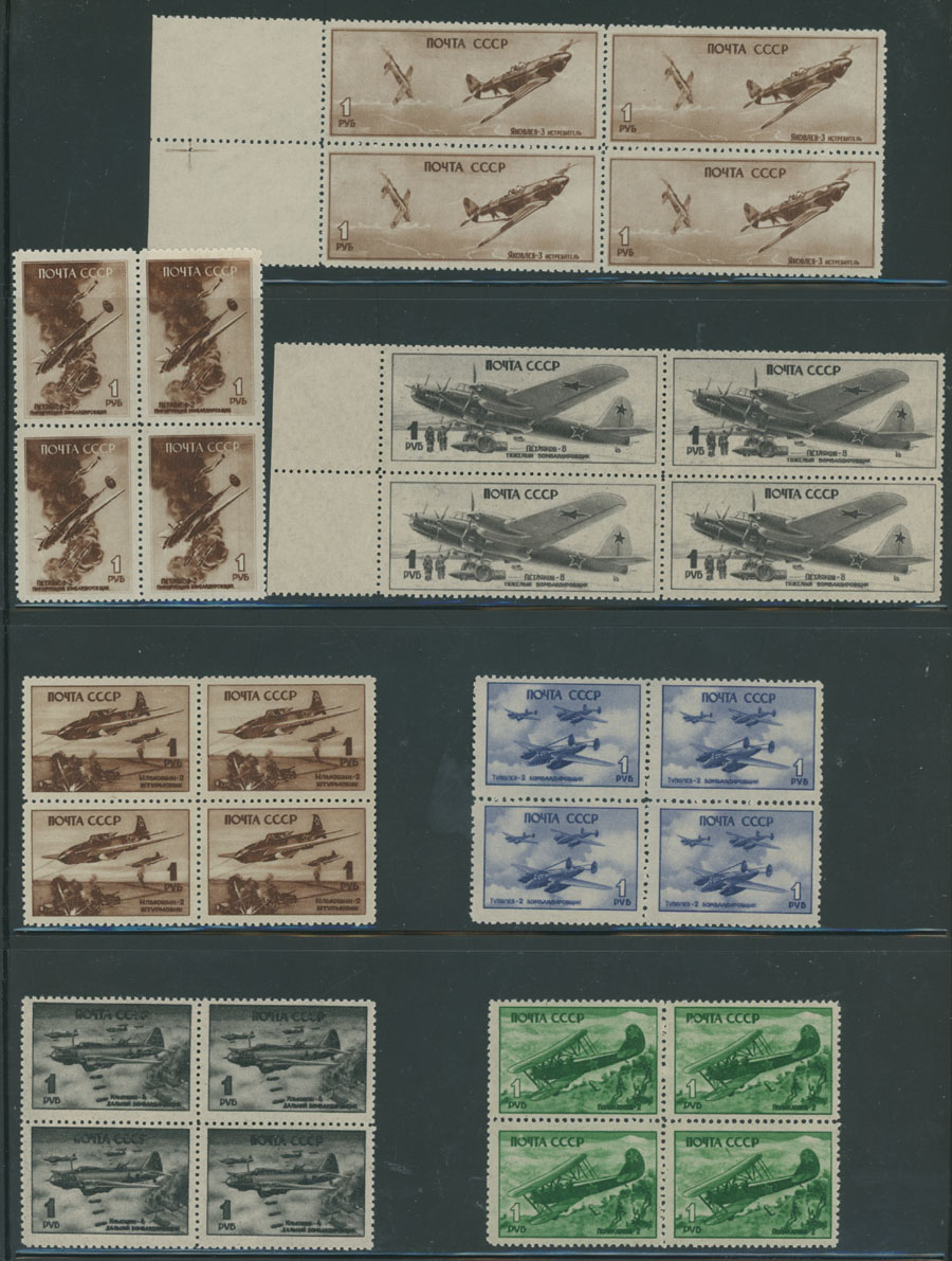 1945-46, Military Airplanes, 1 rub denominations and 5k- 60k, two complete sets of nine, blocks of four, some with sheet margins, nice and fresh quality unit, full OG, NH, VF, C.v. $300++, Est. $300-$350 , Scott #992A-I, 993-1001