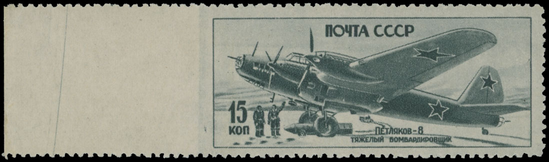 1946, Heavy Bomber ”Petlyakov 8”, 15k blue green, left sheet margin single, imperforate between stamp and margin, full OG, NH, VF, Est. $400-$450 , Scott #992D var