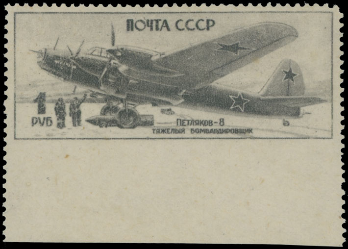1945, Heavy Bomber ”Petlyakov 8”, 1r gray black, lower sheet margin single, imperforate at the bottom, full OG, NH, VF, Est. $400-$500 , Scott #993 var