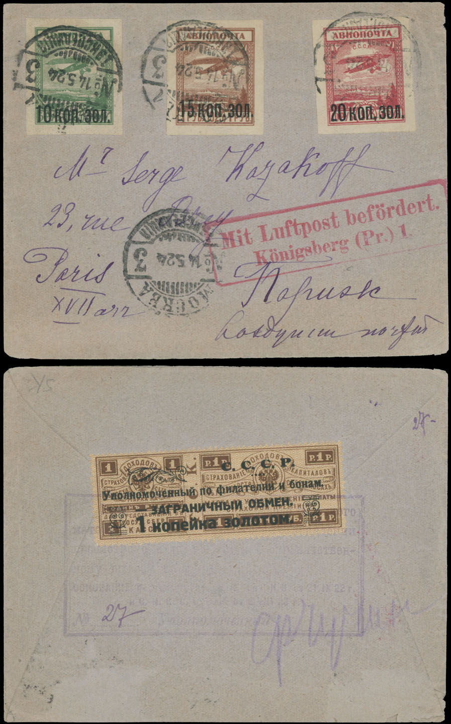 1924 (May 14-15), Pioneer Flight Philatelic Exchange cover from Moscow to Paris via Koenigsberg and Berlin, franked by three Air Post surcharges, Koenigsberg transit handstamp on front and exchange stamp of 3k/3r tied by official hs and bearing real signature of F. Chuchin is on reverse, F/VF, Est. $200-$250, Scott #C7-9