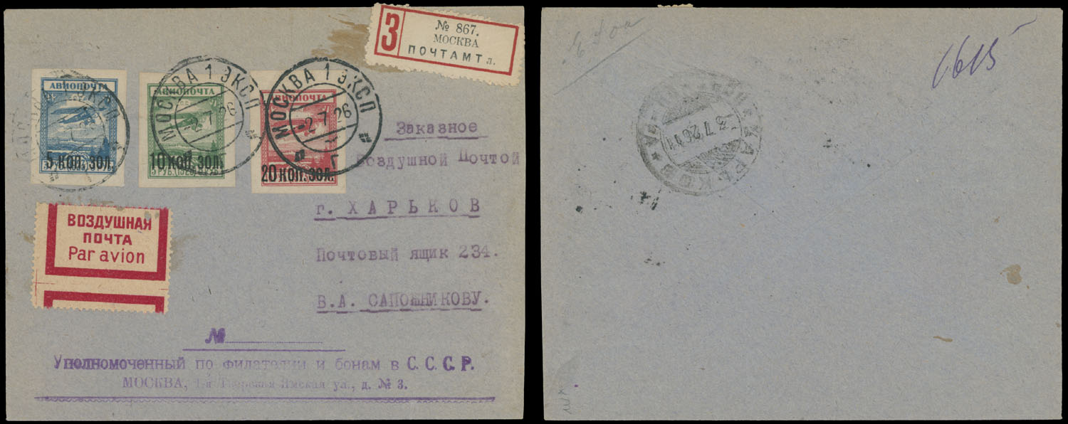 1926 (July 2-3), Pioneer Flight registered cover from Moscow to Kharkov (4th line opening), franked by three surcharged air post values, all appropriate markings and Kharkov ”3.7.26” arrival ds on reverse, mostly VF, Est. $200-$250 , Scott #C6-7, C9