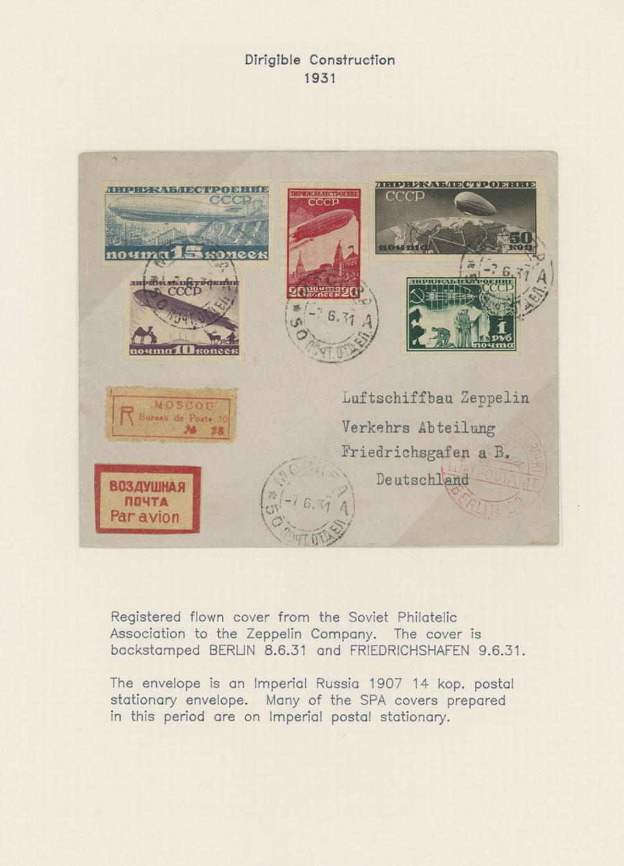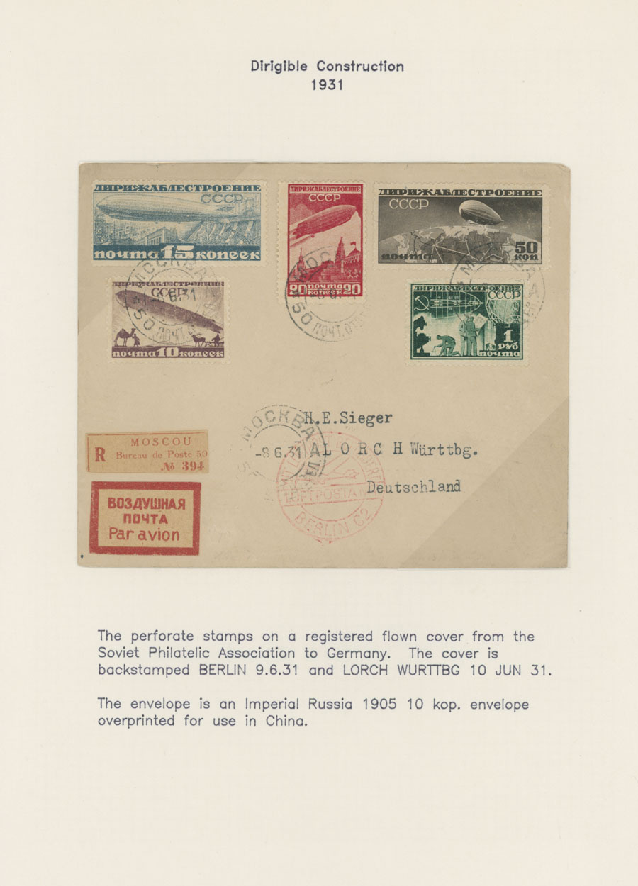 1931 (June7-9), two Pioneer Flight registered covers (presumably FDC), sent from Moscow to Berlin, franked by Airships 10k-1r, imperforate and perforated complete sets of five, tied by Moscow ”7.6.31” and ”8.6.31” date stamps respectively, each one with appropriate arrival ds on reverse, mostly VF, Est. $400-$500, Scott #C15-19, C20-24