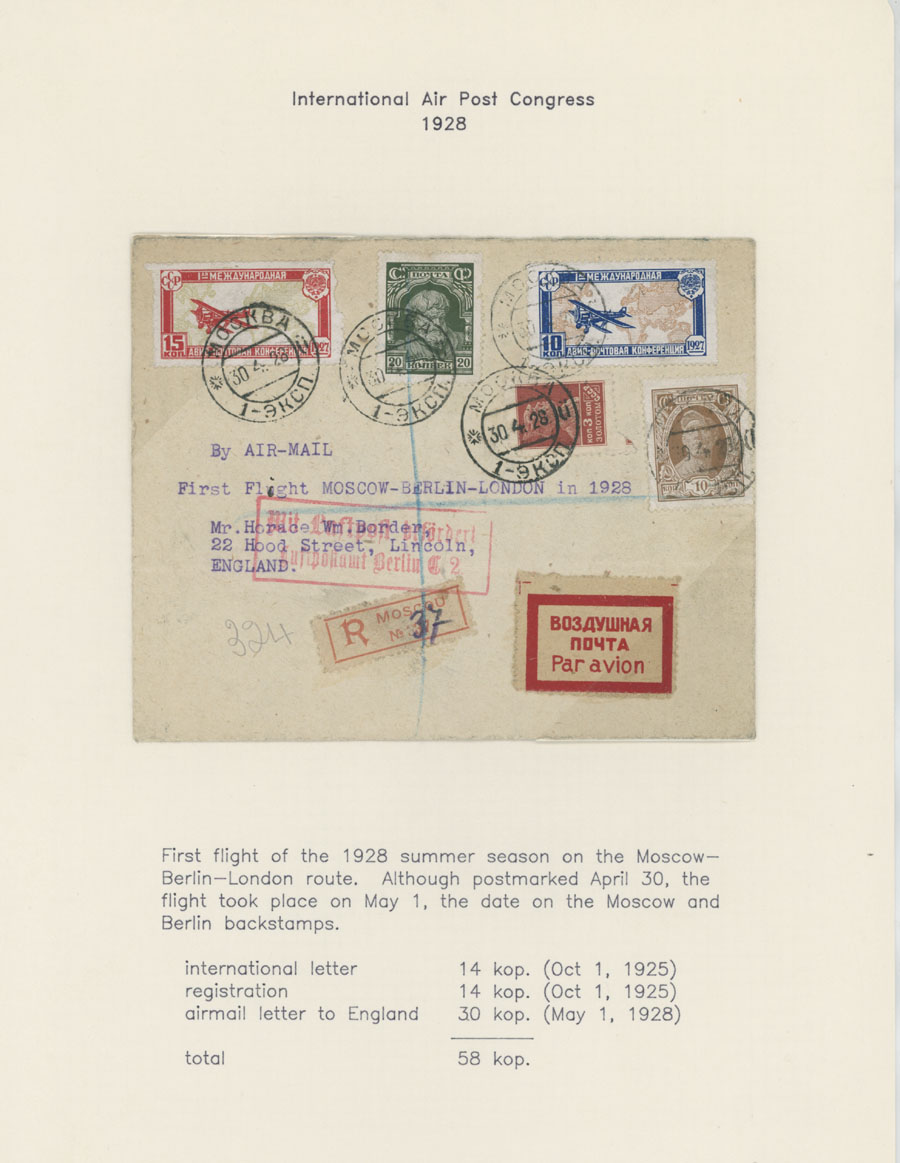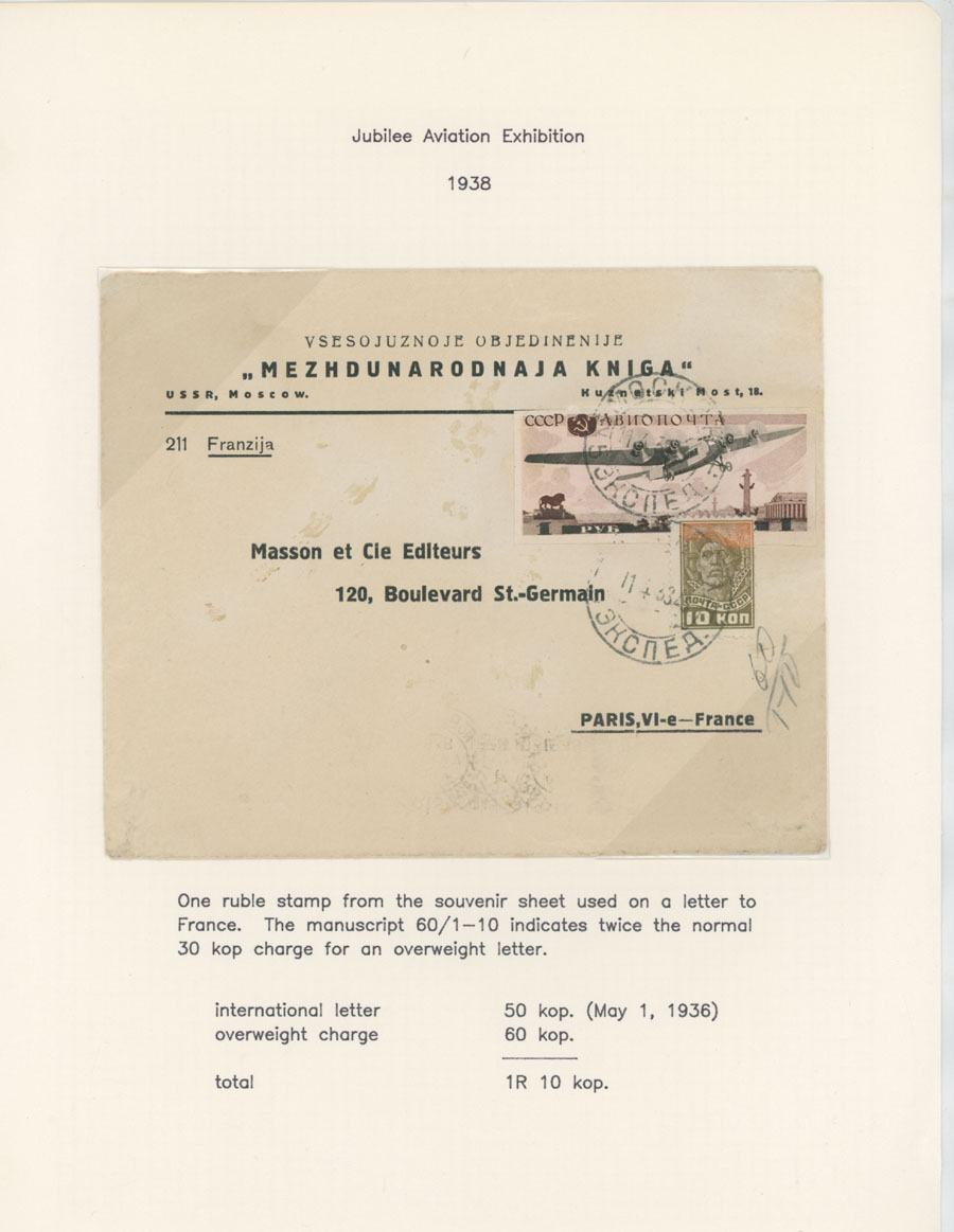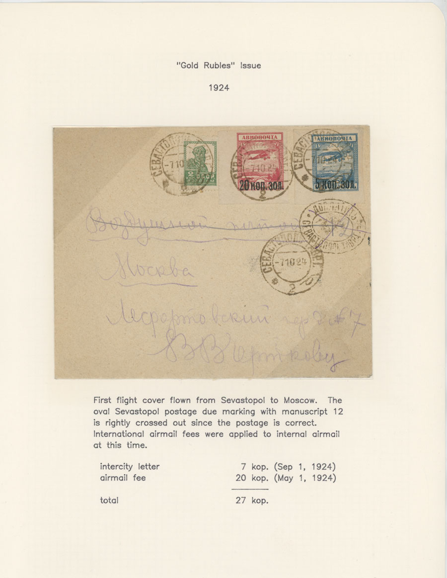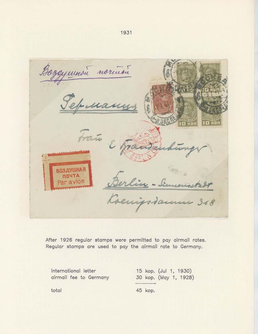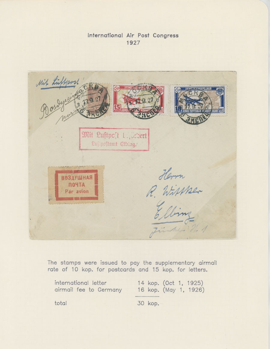 BALANCE OF AIR MAIL POSTAL HISTORY AND AIR POST STAMPS USAGE: 1924-38, 13 covers, starting with cover prepared for the First Flight from Simferopol to Moscow of 1924, two covers to Germany franked by The Hague Postal Conference (#C10-11), two covers delivered on line Leningrad-Berlin with special line cancellation, cover to Paris franked with 1r imperf from Aviation Exhibition souvenir sheet and more, all arranged on pages from a Collection, minor flaws mentioned, F/VF, Est. $400-$500, Scott #C6/C75