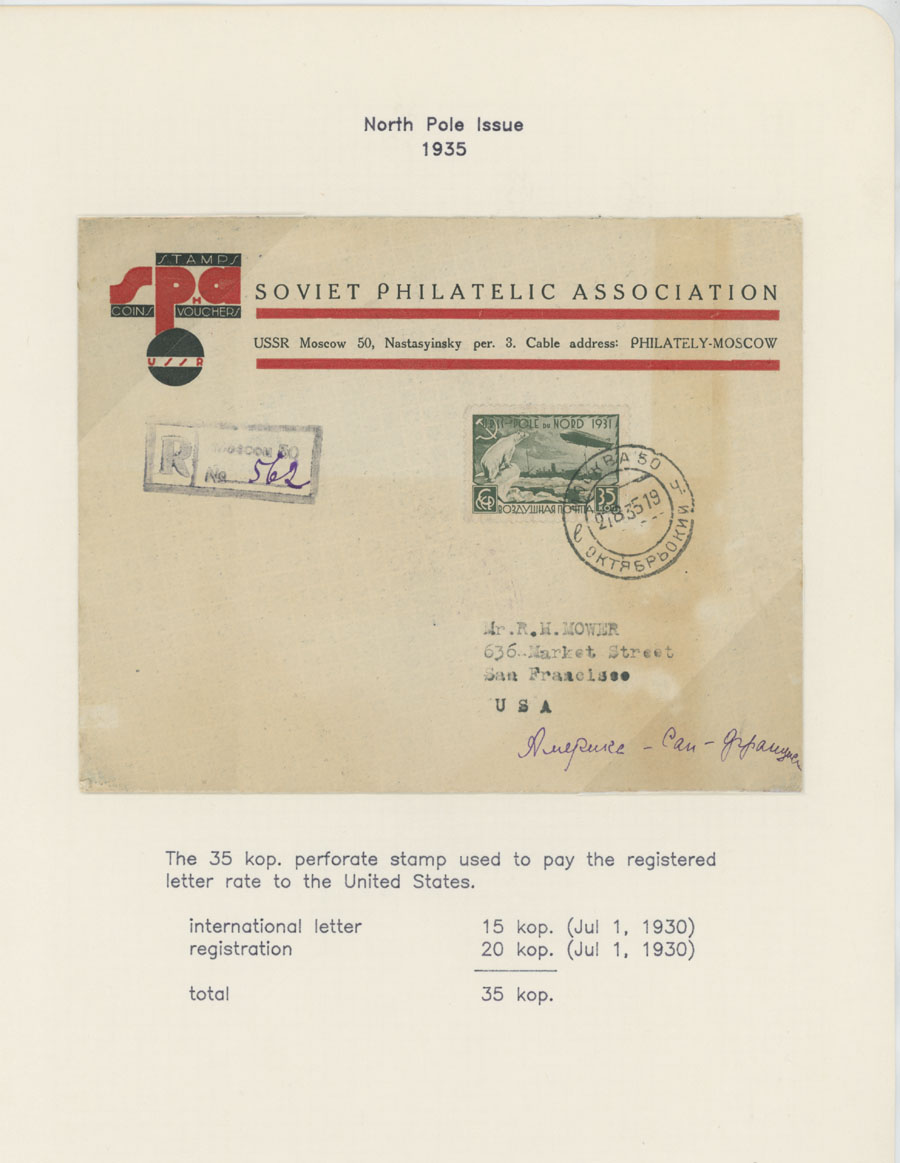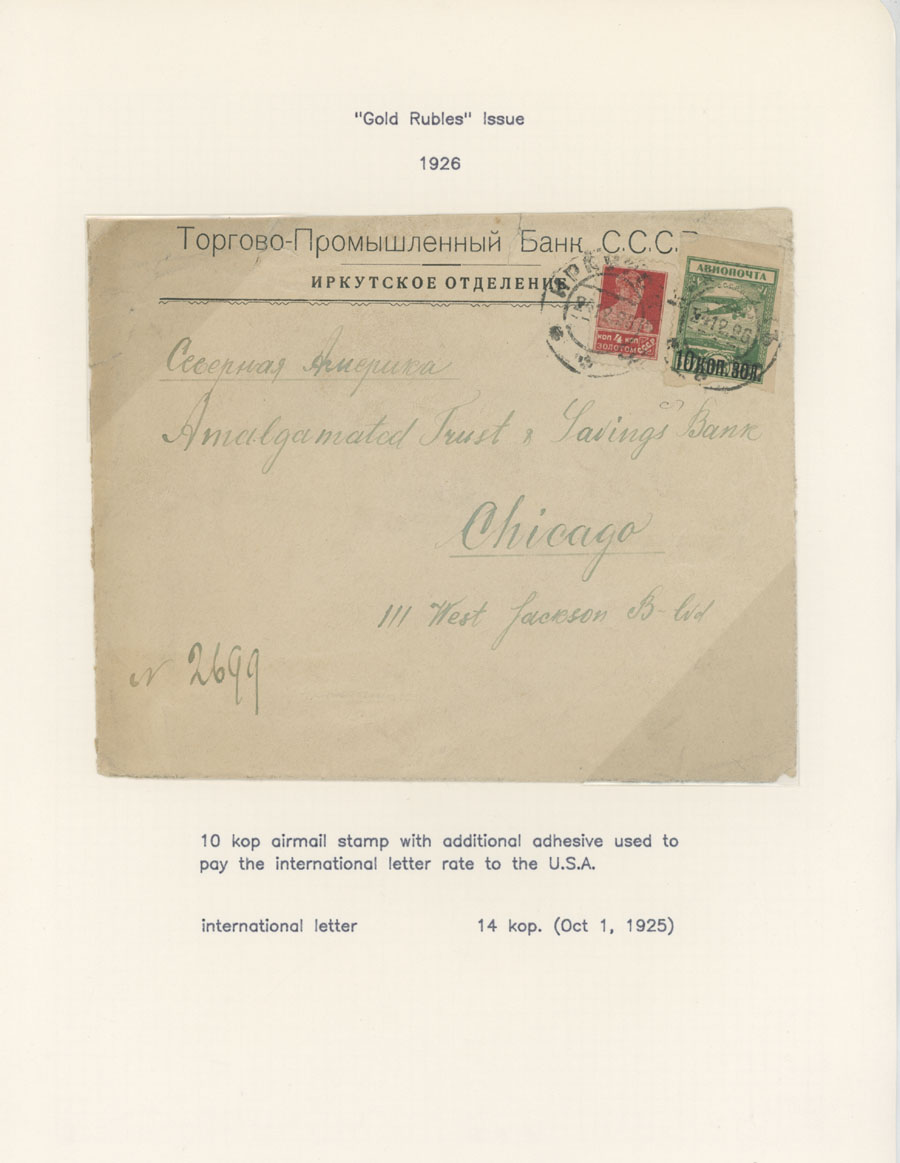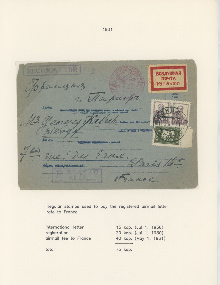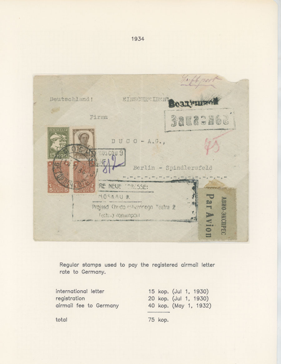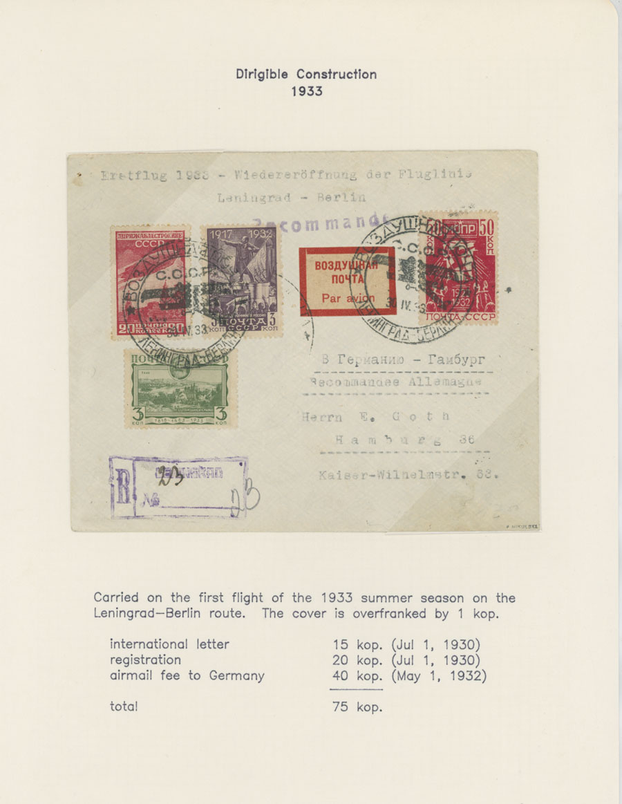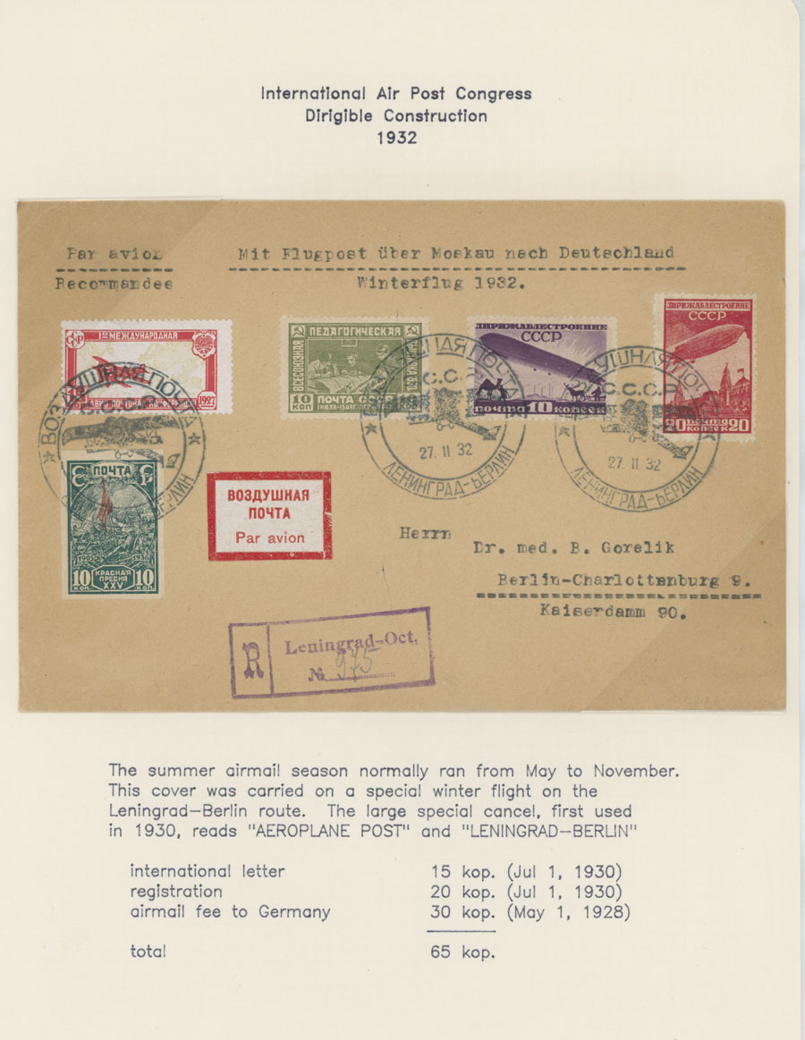 BALANCE OF AIR MAIL POSTAL HISTORY AND AIR POST STAMPS USAGE: 1924-38, 13 covers, starting with cover prepared for the First Flight from Simferopol to Moscow of 1924, two covers to Germany franked by The Hague Postal Conference (#C10-11), two covers delivered on line Leningrad-Berlin with special line cancellation, cover to Paris franked with 1r imperf from Aviation Exhibition souvenir sheet and more, all arranged on pages from a Collection, minor flaws mentioned, F/VF, Est. $400-$500, Scott #C6/C75