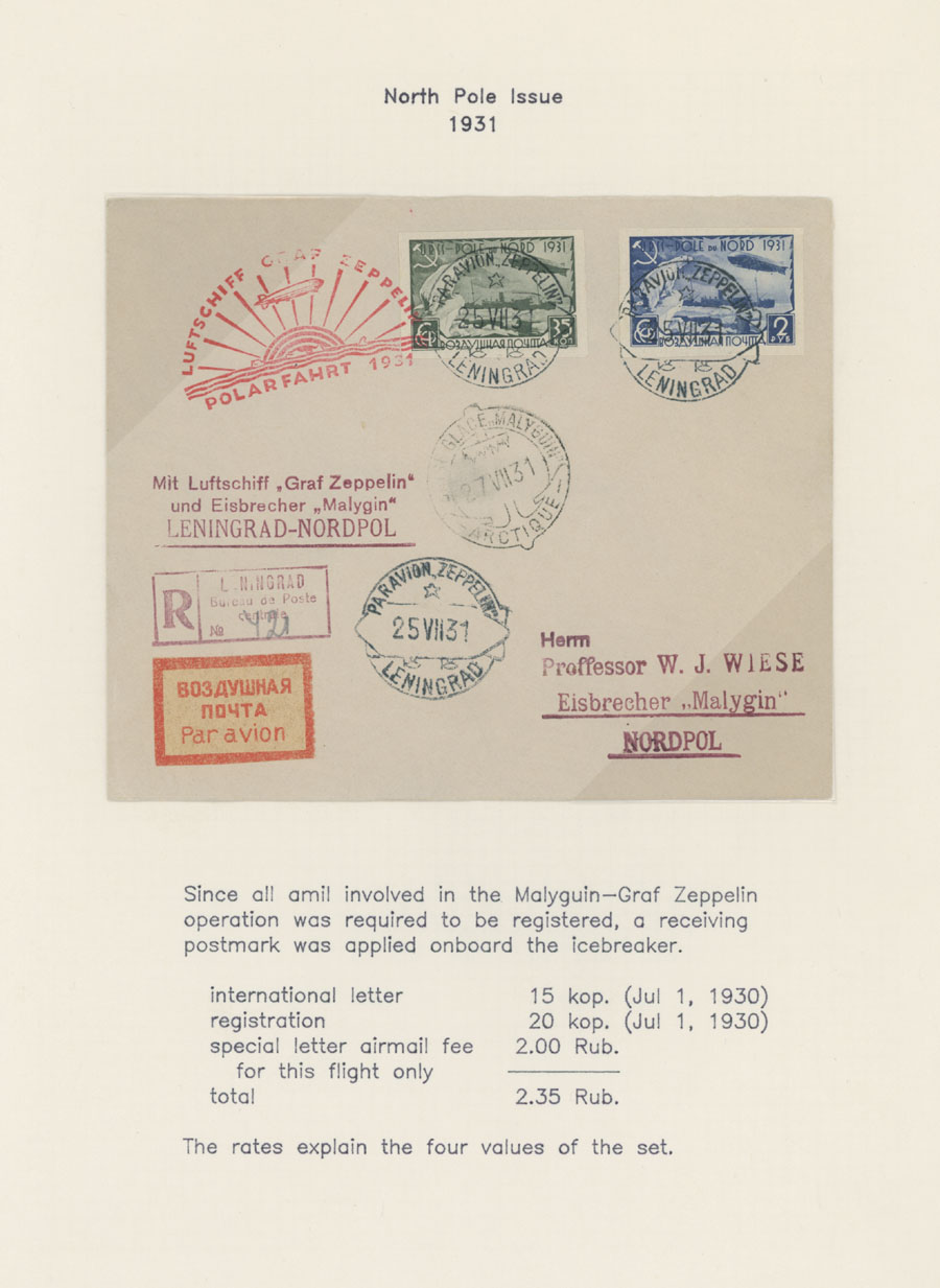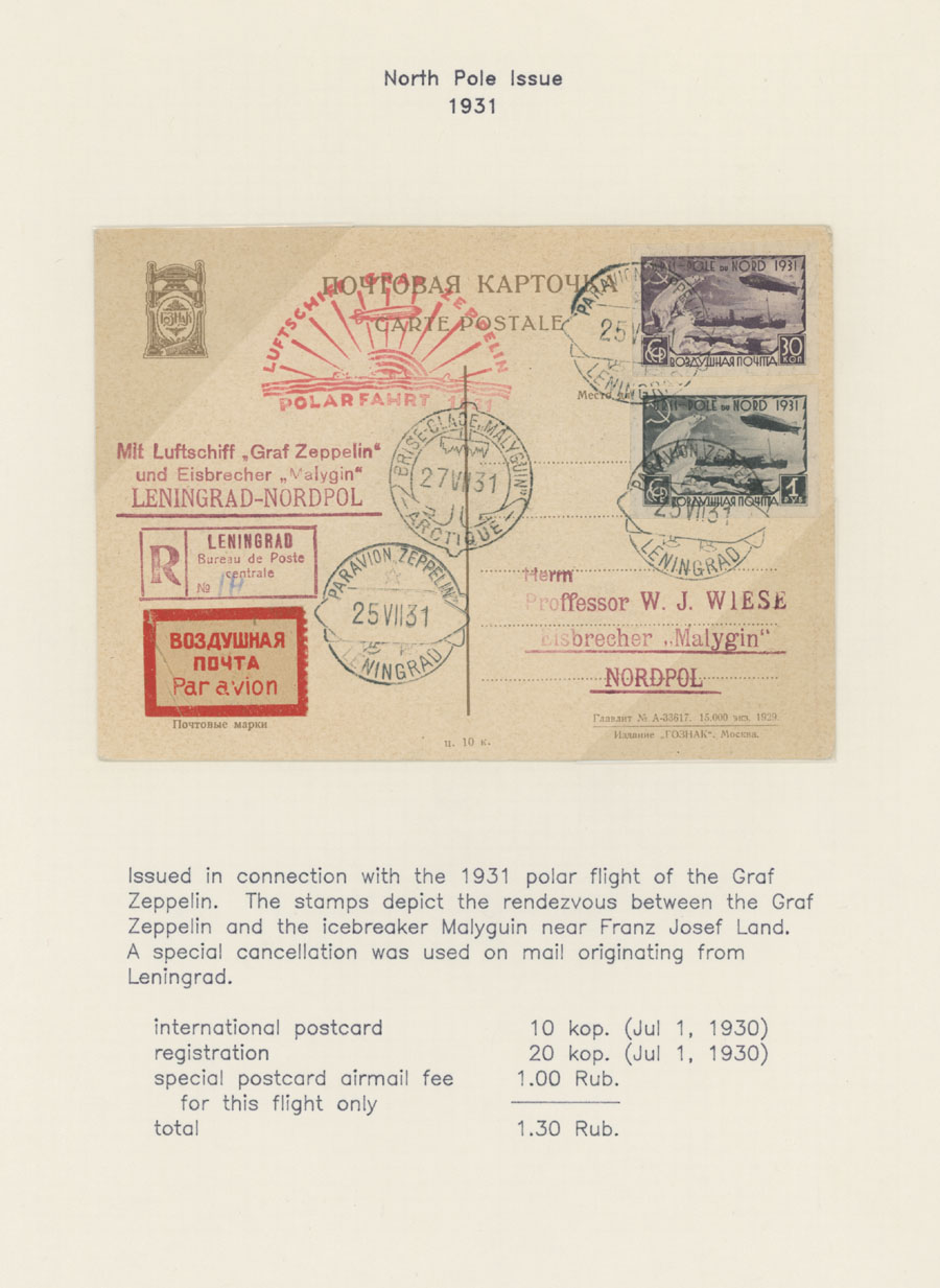 1931 (July 27-31), North Pole Return Flight card and cover from Ice-Breaker ”Malygin” to Germany, franked by specially issued imperforate complete set of four, 30k and 1r for card and 35k and 2r for cover, cancelled ”18.VII.31” by special date stamp, German confirmation cachet, Friedrichshafen ”31.7.31” arrival handstamp and all appropriate markings, VF, Sieger #120Aa, Ab, Est. $300-$350, Scott #C26-29