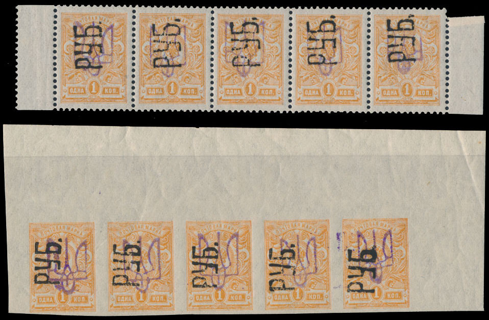1920, black upwards overprint ”RUB” over violet Kiev trident type 2 overprint multiple handstamp on 1k orange in perforated and imperforate side margin horizontal strips of five, full OG, NH, mostly VF, expertized by J. Bulat and W. Pohl, C.v. $400 as hinged singles, Est. $250-$300, Scott #61-62 var