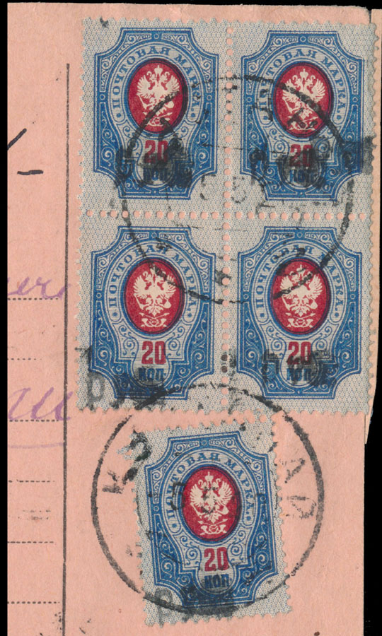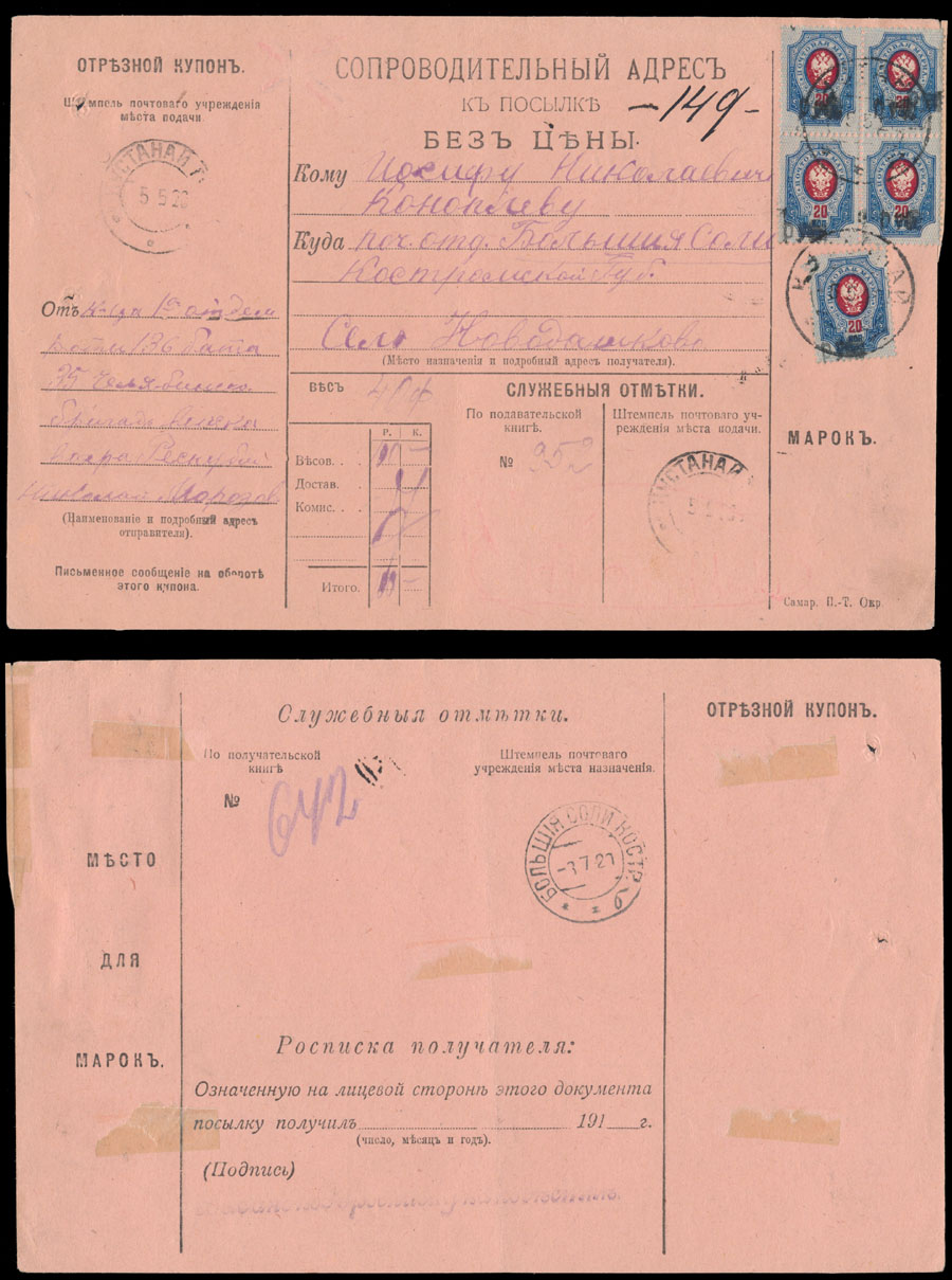 1920, parcel card from Kustanay to Bol’shie Soli (Kostroma Gub.), franked by five stamps with black handstamped surcharge ”rub” on 20k blue and red, including block of four, upper right stamp with double handstamp variety, postmarked on arrival, fresh condition, counterfoil is attached, VF and rare franking, Geyfman #21, Est. $400-$500