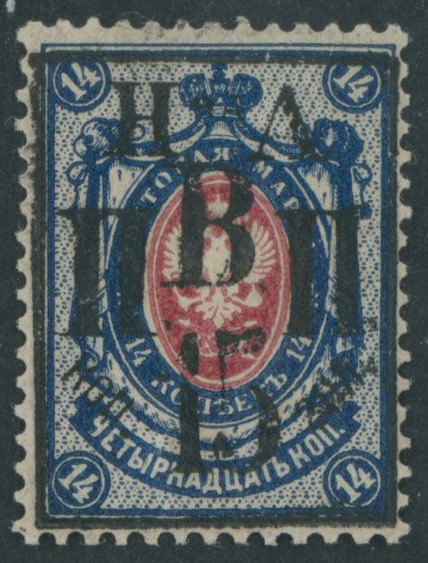 1921, black handstamped surcharge 15k on perforated stamp of 14k blue and carmine, full OG, NH, VF, guaranteed genuine, neat expert’s sign on reverse, C.v. $200 as hinged, M. Kramarenko ”Russika” Cat. #6, C.v. $375, Est. $300-$350, Scott #53