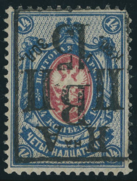 1921, inverted black handstamped surcharge 15k on 14k blue and carmine, slightly rounded top right corner, full OG, LH, F/VF and very rare, only a few stamps received inverted surcharge, expertized by A. Rosselebitch and S. Papadopulo, C.v. $750, Russika (M. Kramarenko) #6 Tc, C.v. $1,150, Est. $600-$700, Scott #53a