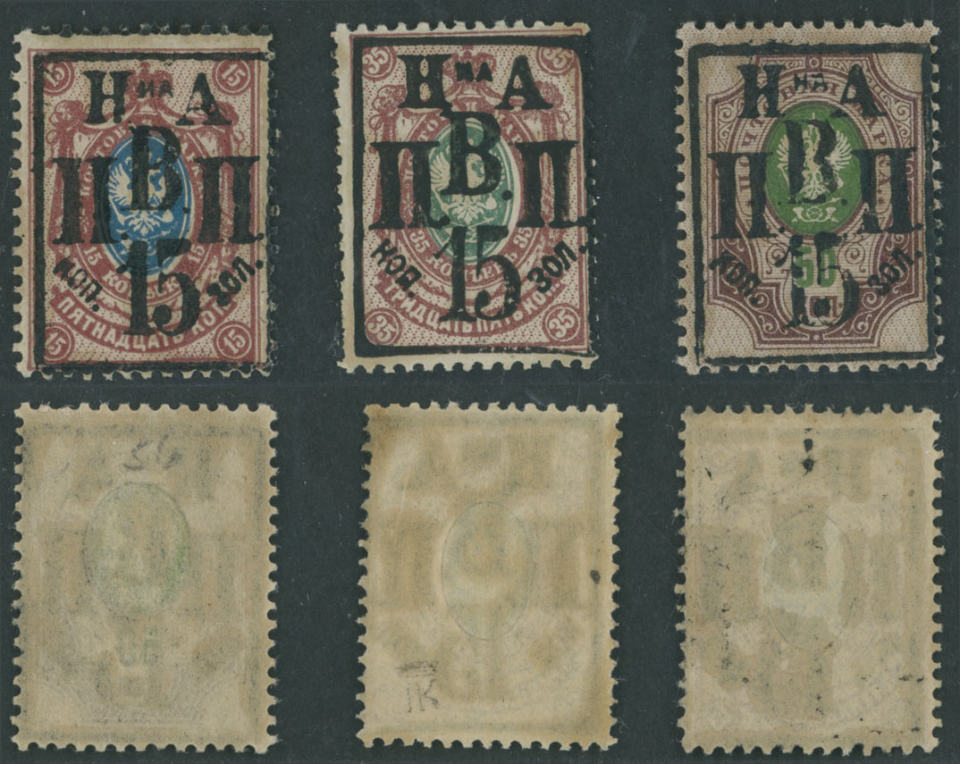 1921, black handstamped surcharge 15k on perforated stamps of 15k, 35k and 50k, all with full OG, NH, VF and very scarce in sound condition, guaranteed genuine, C.v. $225 as hinged, M. Kramarenko ”Russika” Cat. #7-9, C.v. $925, Est. $400-$500 , Scott #54-56