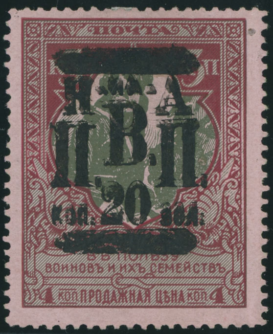 1921, double black handstamped surcharge 20k on World War I Charity stamp of 3+1k red and gray green on pink paper, full OG, previously hinged, VF and extremely rare, only a few stamps are in existence, expertized by Z. Mikulski, S. Pappadopulo and others, this rarity is not listed either in Scott or Russika Cat., Est. $1,500-$1,800, Scott #64 var