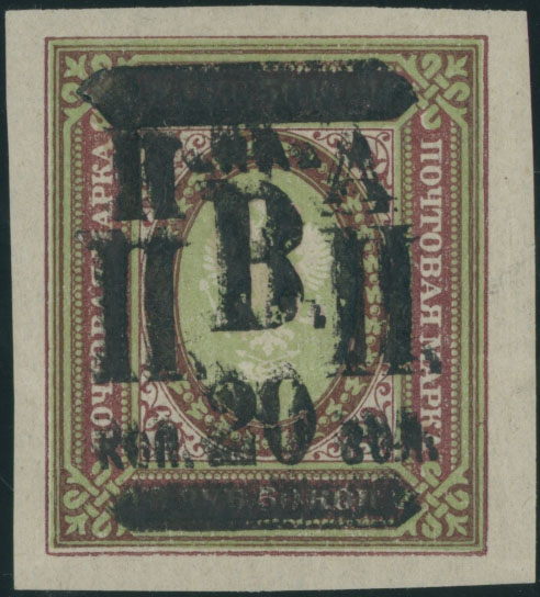 1921, double black handstamped surcharge 20k on imperforate 3.50r maroon and green, full OG, VLH, VF and exceedingly rare, only a handful known, expertized by Romeko, this rarity is not listed either in Scott or Russika Cat., Est. $1,200-$1,500 , Scott #71 var