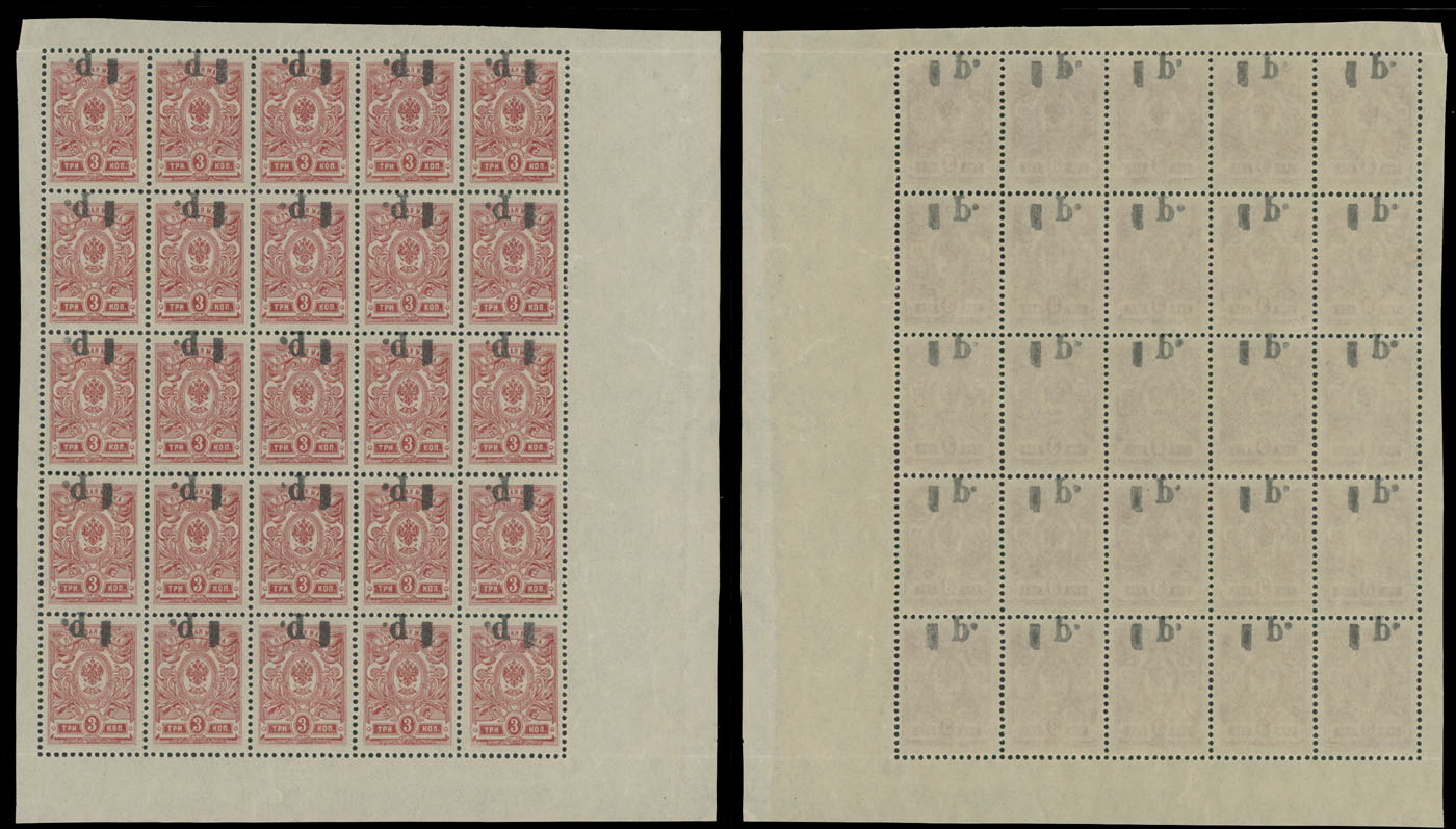 1918-20, inverted black surcharge 1r on perforated 3k red, complete pane of 25, full OG, NH, VF, C.v. $1,250 as hinged, Est. $500-$600 , Scott #24a